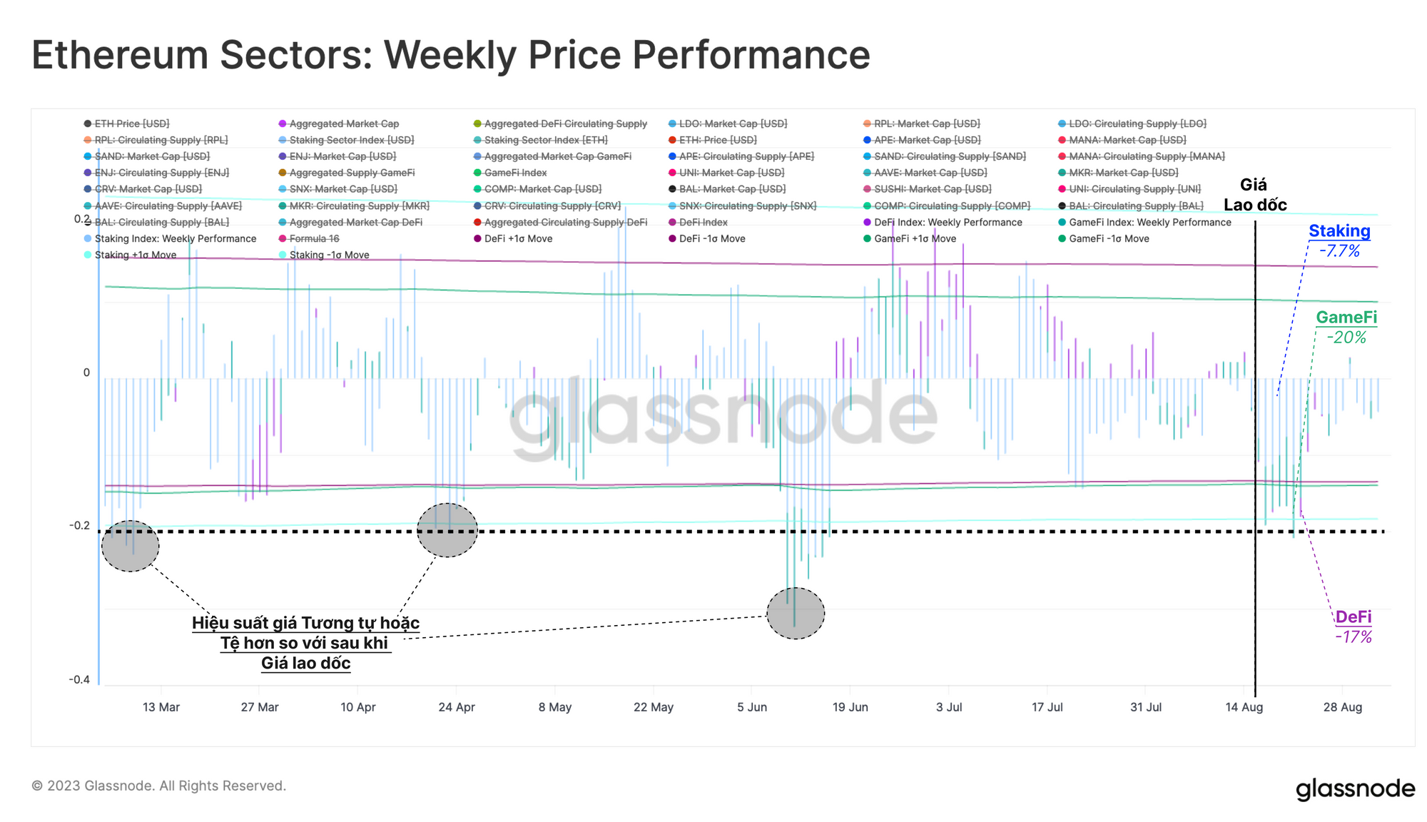 Chúng ta có thể thấy rằng token DeFi và GameFi hoạt động tương đối kém (-17%) và (-20%) so với các tài sản chính, trong khi token Liquid Staking hoạt động có phần tốt hơn (-7,7%). Tuy nhiên, nhìn chung thì giá suy giảm tương tự hoặc ít nghiêm trọng hơn so với những đợt suy thoái được thấy vào tháng 3, tháng 4 và tháng 6.