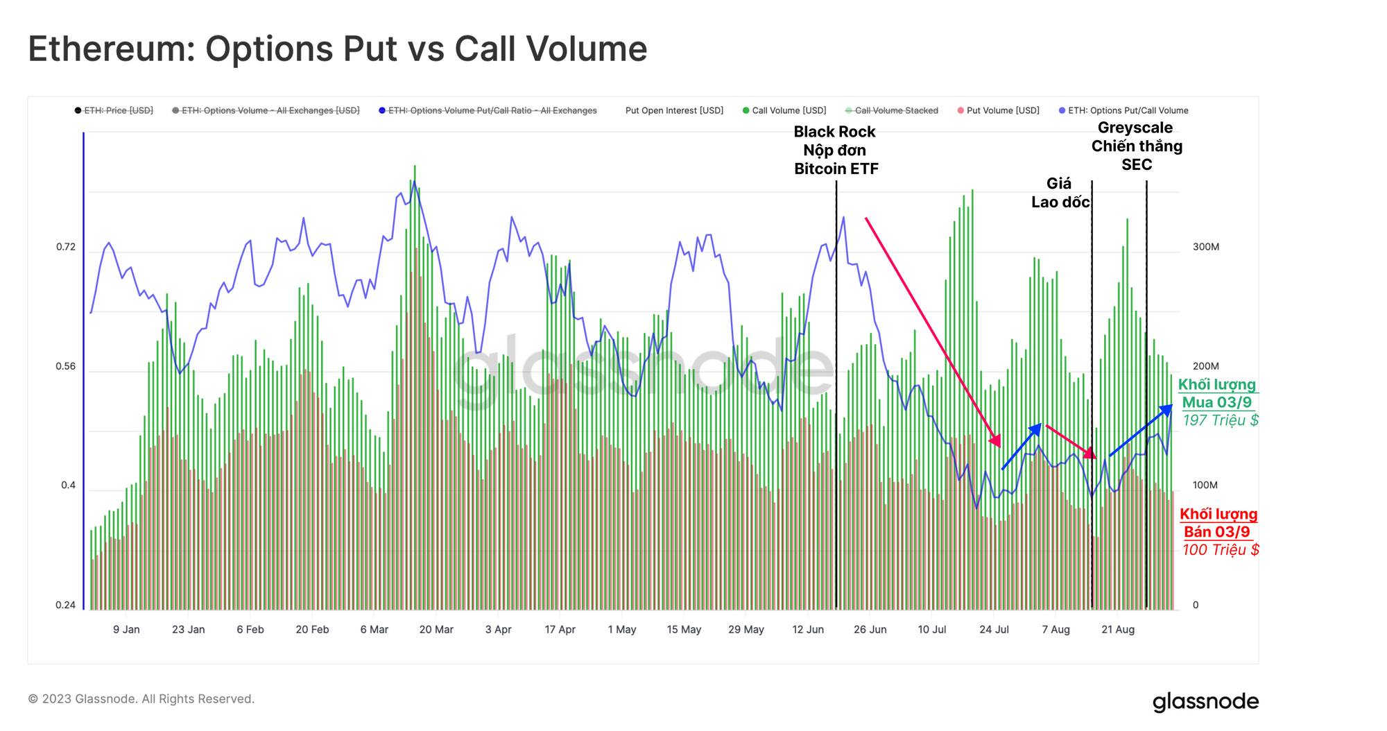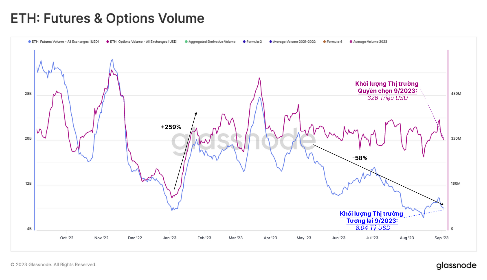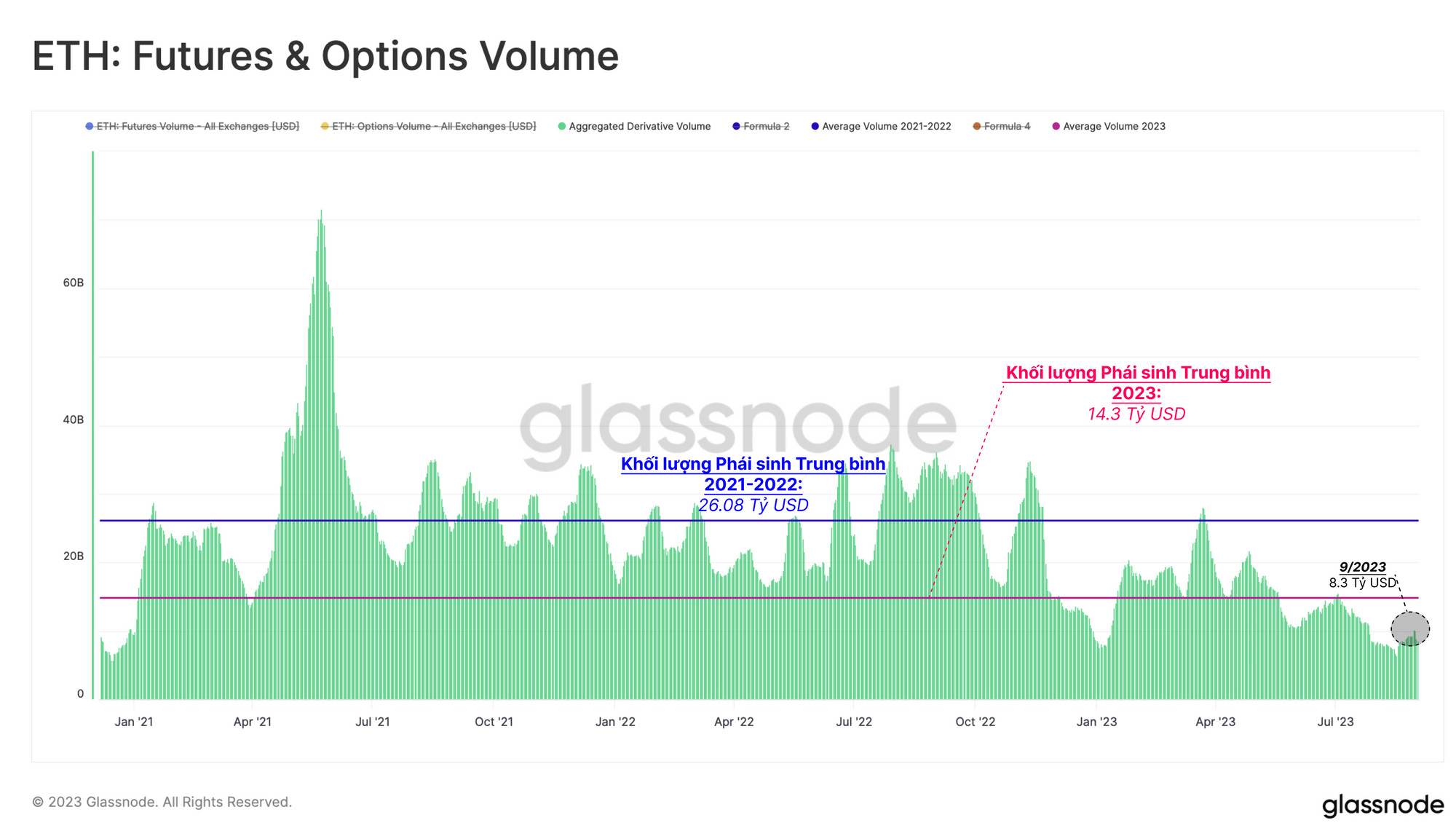Hoạt động chung trên các thị trường quyền chọn và tương lai Ethereum năm 2023 thấp hơn đáng kể so với năm 2021 và 2022. Khối lượng giao dịch trung bình hàng ngày trên cả hai thị trường đã giảm xuống chỉ còn 14.3 tỷ USD/ngày, bằng khoảng một nửa khối lượng trung bình trong hai năm qua. Tuần này, khối lượng thậm chí còn thấp hơn ở mức 8.3 tỷ USD/ngày, cho thấy thanh khoản trong ngành tiếp tục cạn kiệt.