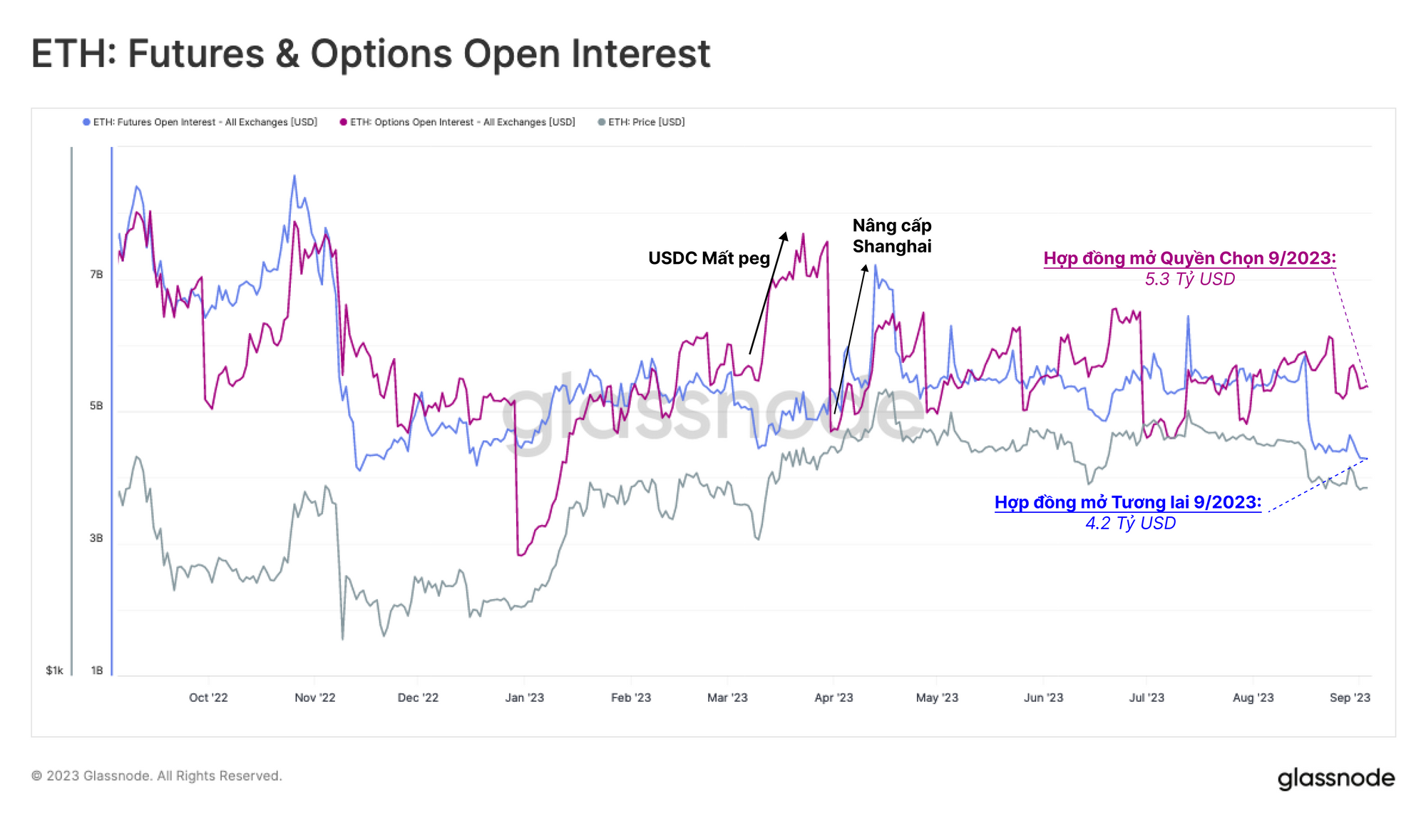 Xu hướng này được phản ánh trong Hợp đồng Mở phái sinh. Sau đáy thị trường được thiết lập sau sự sụp đổ của FTX, Hợp đồng Mở bắt đầu tăng vào đầu năm 2023. Đối với Quyền chọn, hợp đồng mở đạt đỉnh điểm trong cuộc khủng hoảng ngân hàng tháng 3 khi USDC mất peg 1 USD. Hợp đồng mở thị trường tương lai Ethereum đạt đỉnh điểm xung quanh Nâng cấp Shanghai, cho thấy đây là sự kiện đầu cơ lớn cuối cùng đối với tài sản này.