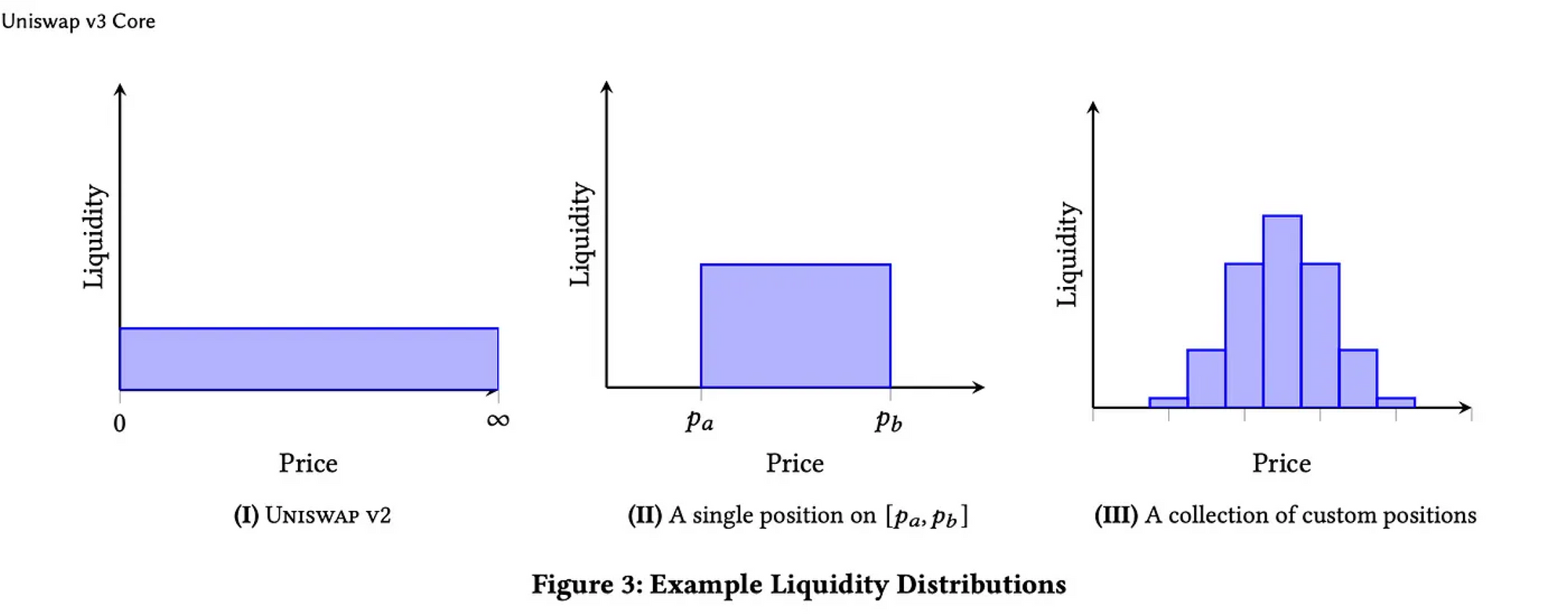 Uniswap V3 có một tính năng độc đáo là thanh khoản tập trung. Các nhà cung cấp thanh khoản (LP) có thể chọn một phạm vi giá mà thanh khoản được cung cấp bởi họ sẽ tập trung. Phí chỉ được tính khi thị trường giao dịch trong phạm vi này (tương tự như giá thực hiện), phạm vi càng hẹp thì doanh thu phí tương đối càng lớn. Điều này mang lại trải nghiệm người dùng tốt hơn cho các nhà giao dịch DEX, vì chênh lệch giá có xu hướng nhỏ hơn và cải thiện hiệu quả sử dụng vốn cho LP.
