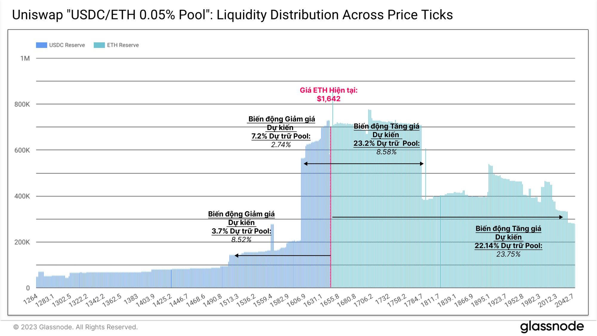 Khi kiểm tra sự phân bổ thanh khoản trên các phạm vi giá khác nhau trong pool Uniswap, chúng tôi có thể thấy rằng các LP hiện đang cung cấp phần lớn thanh khoản cao hơn mức giá hiện tại.