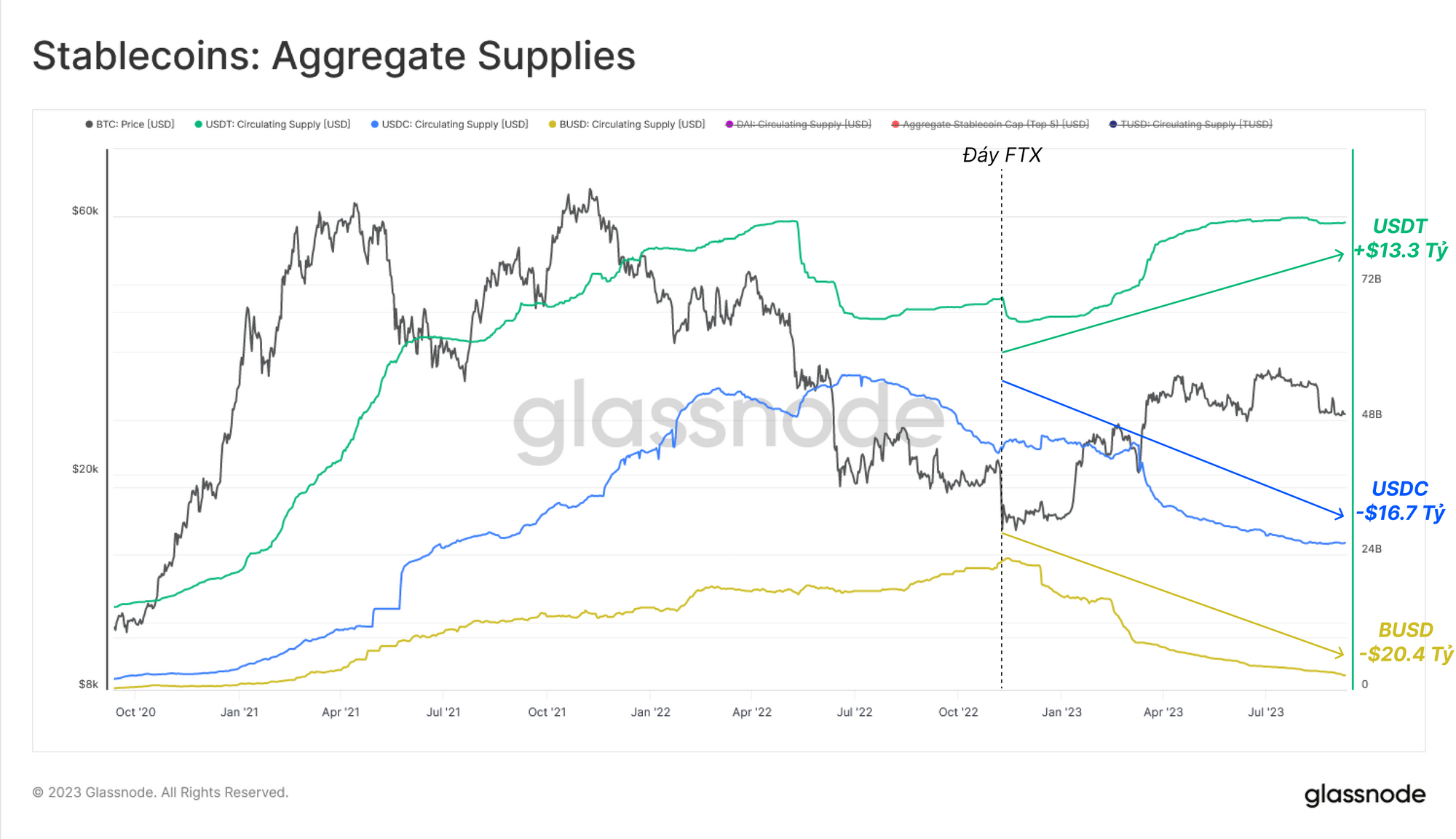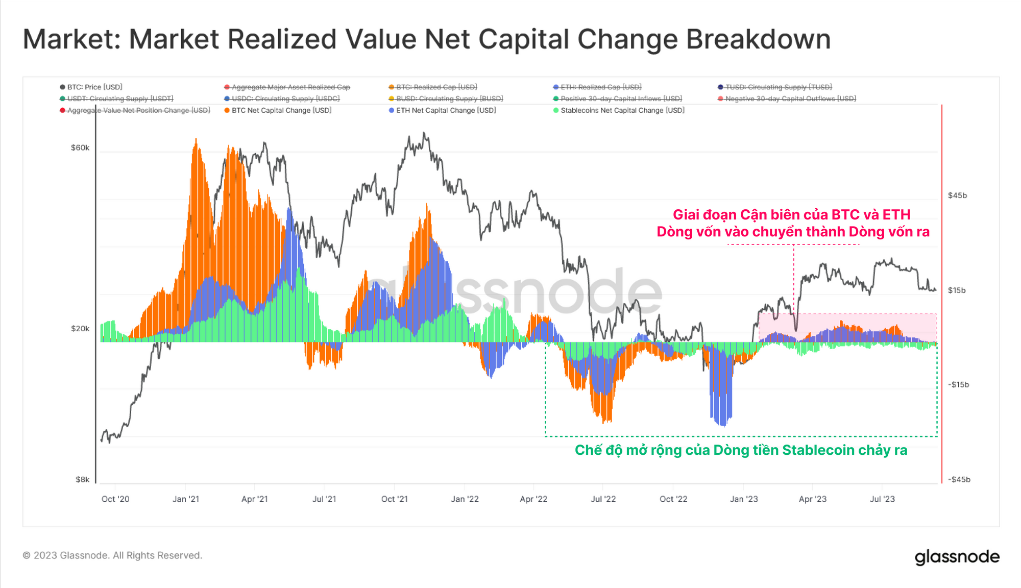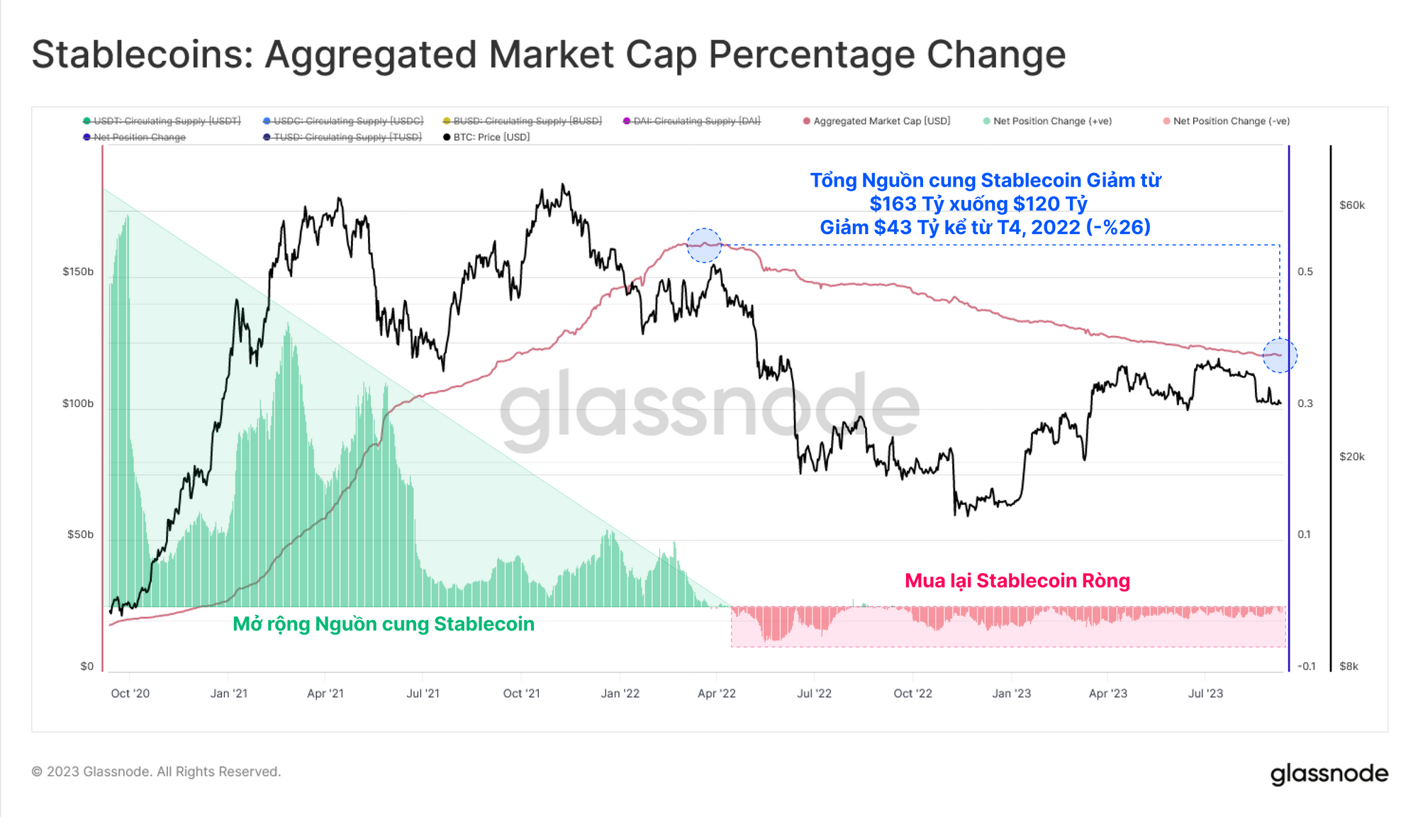 Nếu tách riêng các stablecoin, chúng ta có thể thấy rằng tổng số vốn 43 tỷ USD đã được mua lại, thể hiện mức giảm tổng cộng 26% kể từ mức cao nhất được thiết lập vào tháng 3 năm 2022. Điều này có thể được coi là kết quả không chỉ bởi nguồn vốn rời đi do các điều kiện thị trường gấu mà còn phản ánh chi phí cơ hội của lãi suất cao hơn khi vốn không được chuyển sang các stablecoin không mang lại lợi nhuận.