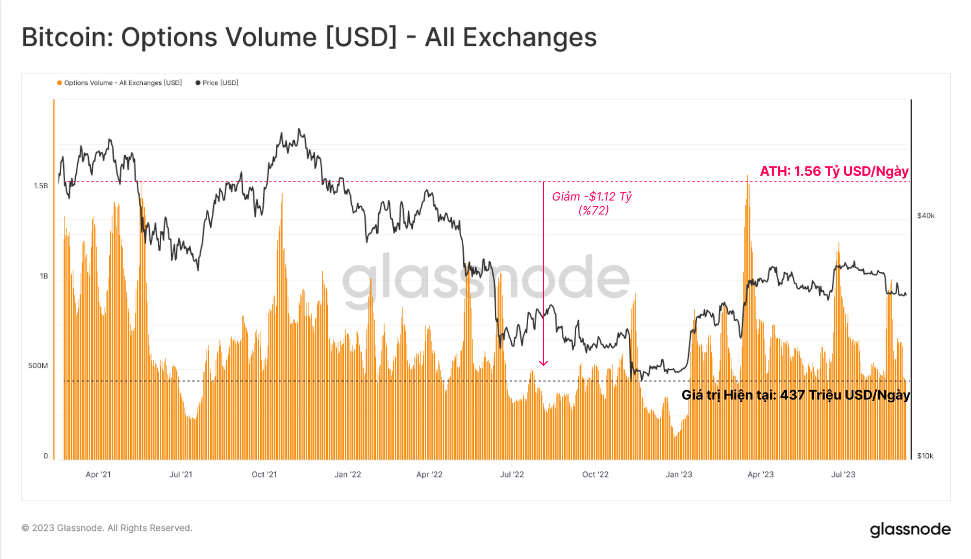 Chuyển sang các thị trường phái sinh ngoài chuỗi, chúng ta có thể thấy rằng khối lượng giao dịch tương lai cũng chịu số phận tương tự, chạm mức thấp lịch sử là 12 tỷ USD/ngày. Khoảng thời gian duy nhất có khối lượng giao dịch thấp hơn là khoảng thời gian tạm lắng vào cuối năm 2022, khi Bitcoin được giao dịch trong phạm vi $557 trong hơn hai tuần (WoC 2).