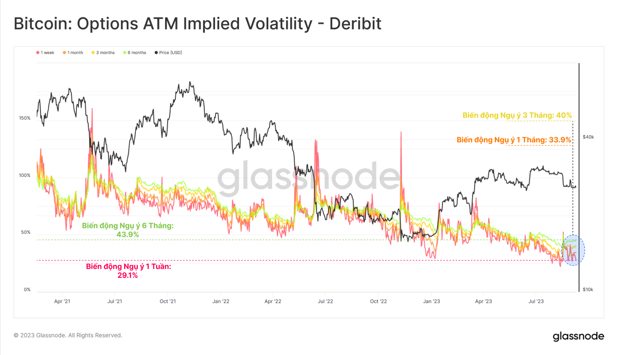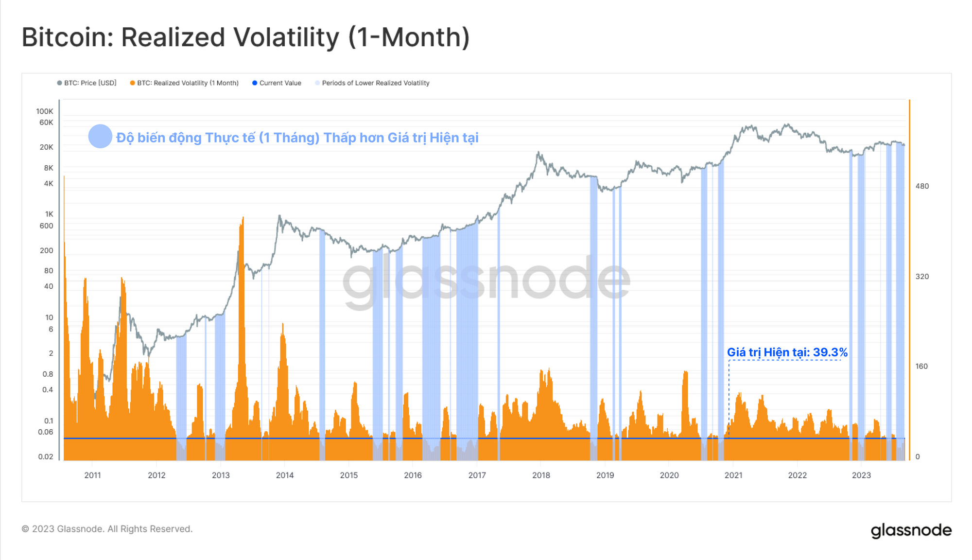 Bất chấp độ biến động tăng đột biến trong đợt bán tháo gần đây của BTC xuống mức $26k và thêm một lần nữa sau khi Grayscale chiến thắng SEC trước tòa, Chỉ số Độ biến động Thực tế vẫn ở mức thấp đáng kể. Thị trường vẫn đang ở trong môi trường biến động thấp lịch sử, thường là dấu hiệu báo trước cho sự biến động tăng cao trong tương lai.