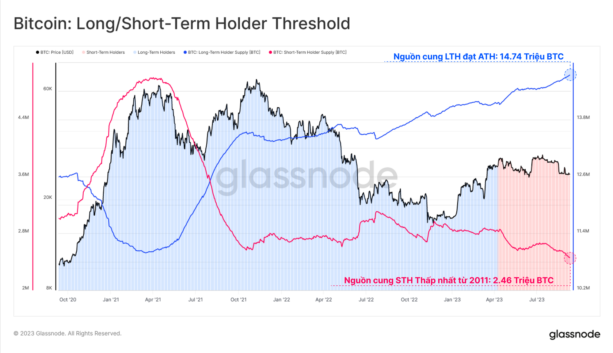 Với việc cả on-chain và off-chain đều đặc biệt yên tĩnh, không có gì ngạc nhiên khi nguồn cung được nắm giữ bởi nhóm Người nắm giữ Dài hạn đã đạt mức ATH mới là 14.74 triệu BTC. Ngược lại, nguồn cung được nắm giữ bởi nhóm Ngắn hạn, đại diện cho phần thị trường năng động hơn, đã giảm xuống mức cung thấp nhất kể từ năm 2011.