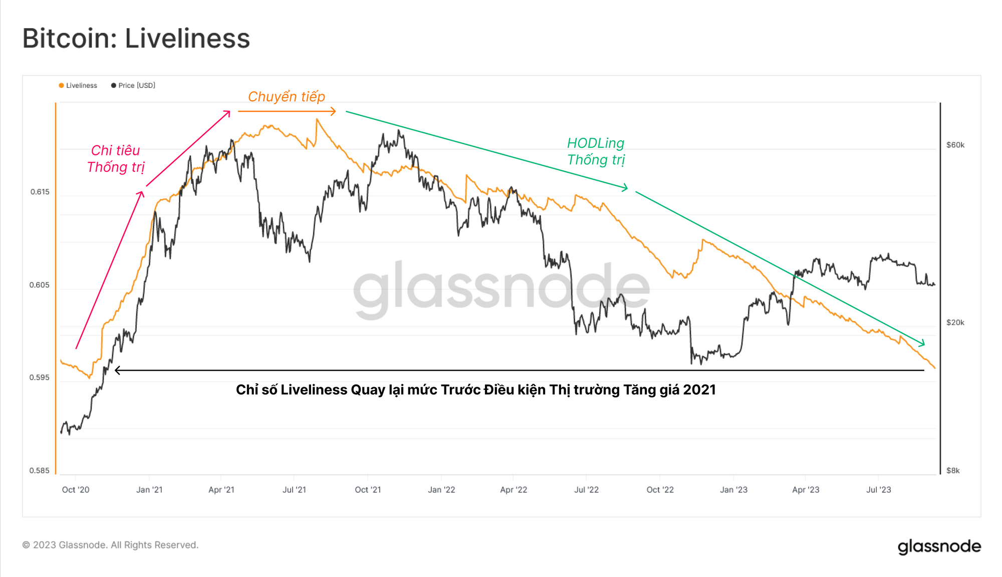Phù hợp với chế độ bên bán ròng đã đề cập ở trên, năm 2021 chứng kiến sự gia tăng đáng kể của Liveliness khi các đồng coin cũ hơn được chi tiêu và thu được lợi nhuận. Khi thị trường giá xuống năm 2022 diễn ra từ tháng 5 đến tháng 12 năm 2021, một xu hướng giảm mạnh đã được hình thành. Điều này đánh dấu một điểm chuyển đổi từ thị trường nhà giao dịch sang thị trường HODLer.