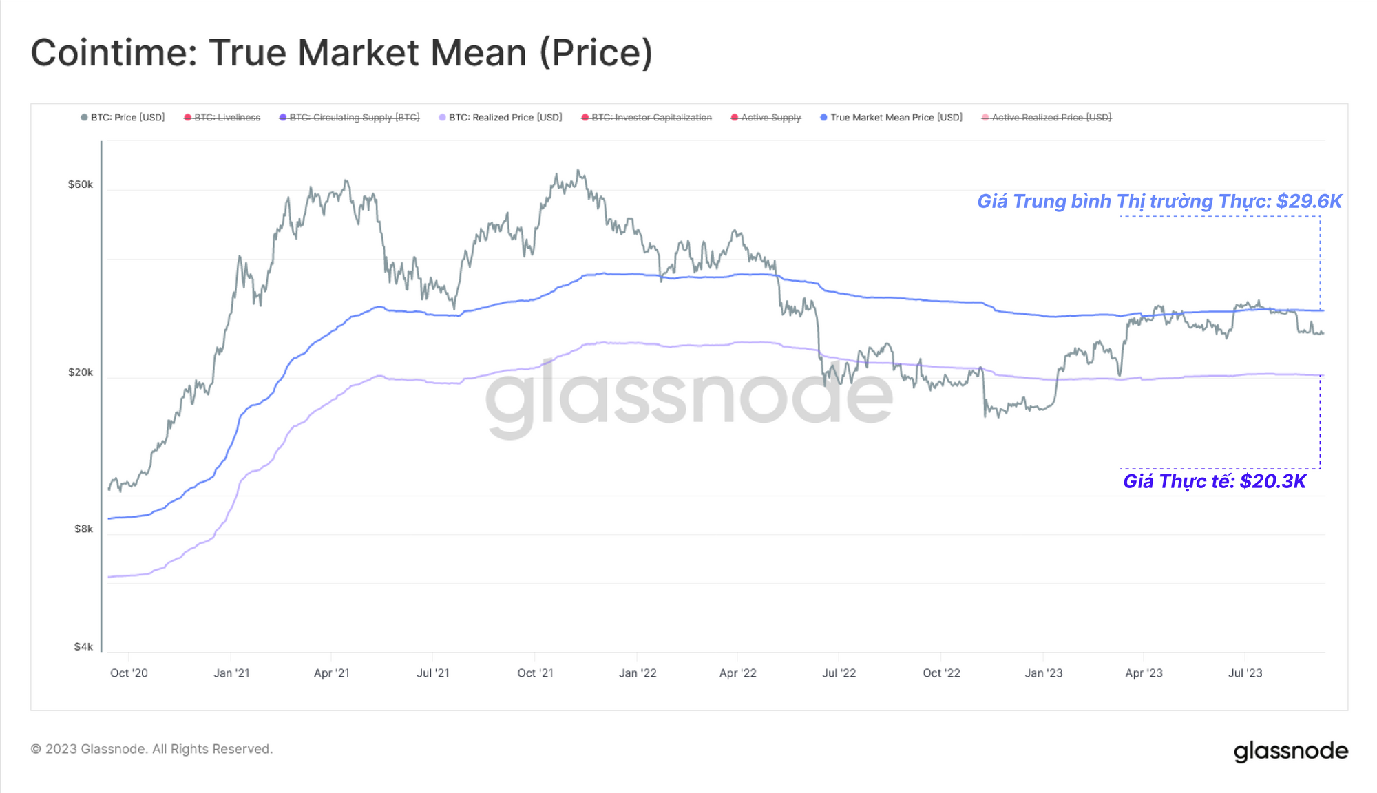 Một chỉ số quan trọng khác là True Market Mean Price, chúng tôi cho rằng đây là mô hình “cơ sở chi phí” chính xác nhất cho các nhà đầu tư Bitcoin đang hoạt động. Mô hình này hiện ở mức $29.6k và đã hình thành mức kháng cự tâm lý kể từ tháng 4 năm nay. Giá Thực tế truyền thống đang giao dịch ở mức $20.3k, với cả hai mô hình đang giới hạn phần lớn hành động giá trong năm.