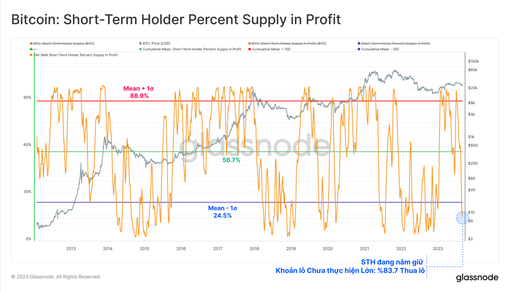 Biểu đồ bên dưới hiển thị phần trăm nguồn cung có lời của Người nắm giữ Ngắn hạn. Chúng ta có thể thấy rằng phần lớn nguồn cung của họ đã rơi vào tình trạng lỗ chưa thực hiện, chỉ có 16.3% nguồn cung vẫn đang “có lãi”.