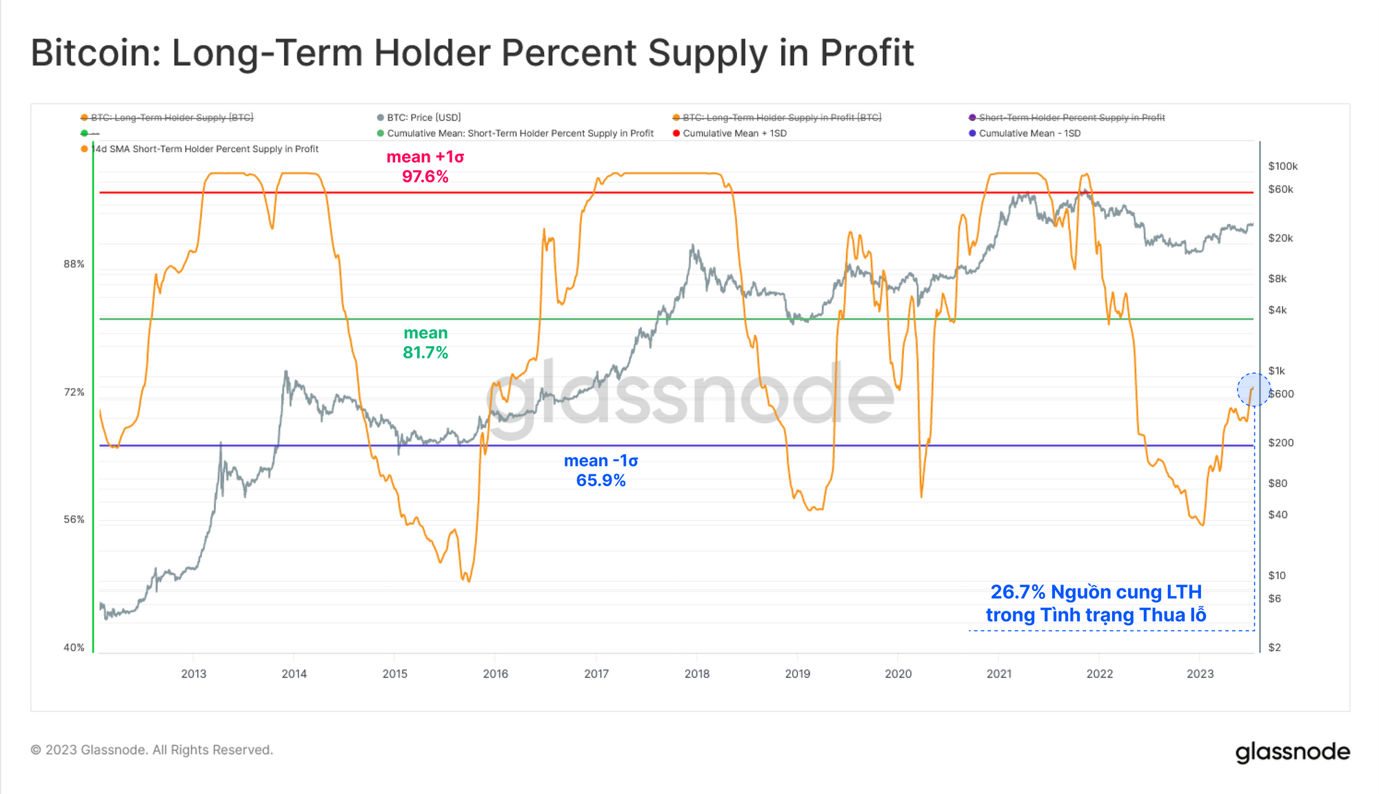 Đối với nhóm Người nắm giữ Dài hạn, lợi nhuận của họ đang dần tăng lên, mặc dù vẫn ở mức thấp trong lịch sử và chỉ mới rời khỏi dải độ lệch chuẩn -1 vài tháng trước. Đây là một xu hướng mang tính xây dựng nhưng hơn 26.7% nguồn cung LTH đang ở mức thấp hơn so với giá mua lại của họ và thấp hơn nhiều so với mức trung bình mọi thời đại.