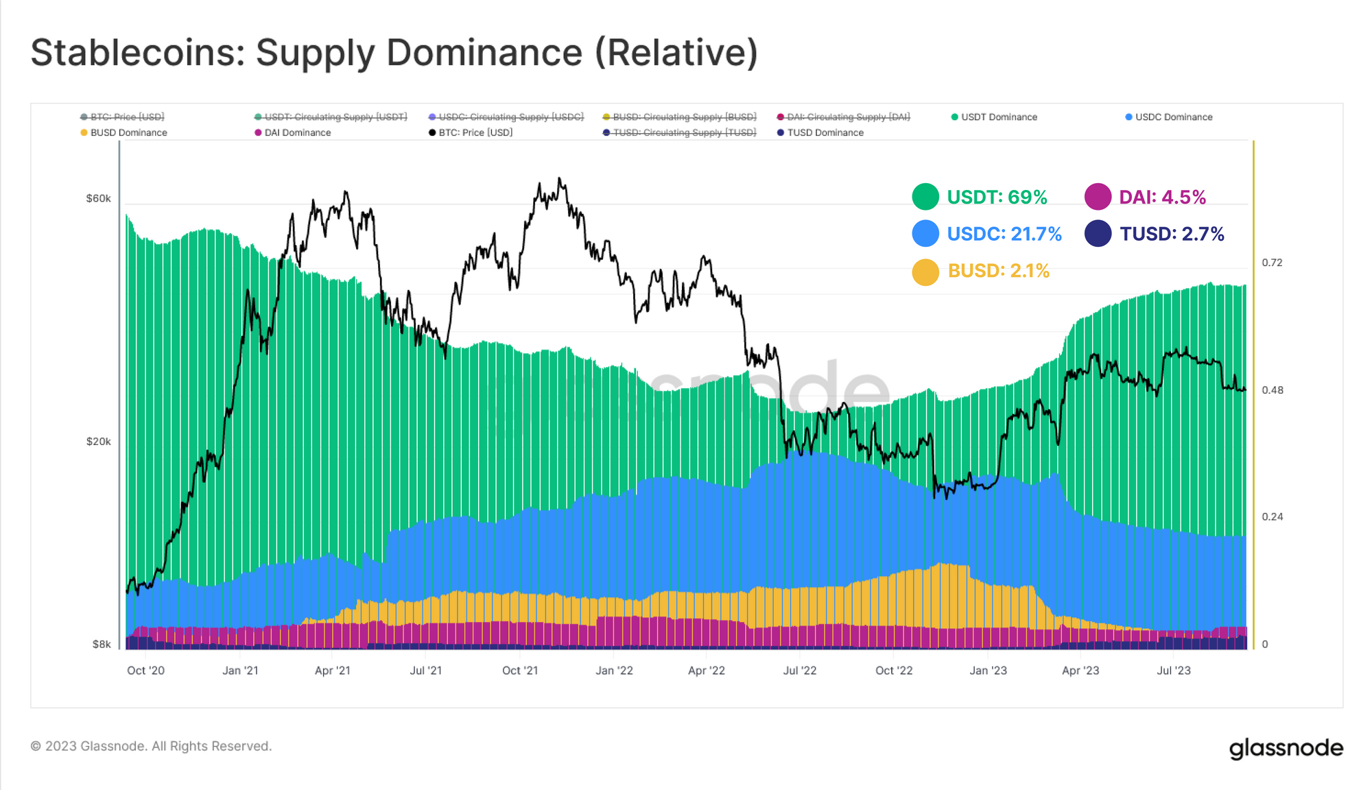Nếu xem xét điều này thông qua sự thống trị tương đối, chúng ta có thể thấy sự mở rộng thị phần của Tether đáng kể như thế nào. USDT hiện chiếm 69% thị trường stablecoin, một sự đảo ngược hoàn toàn so với mức thống trị thấp 44% đạt được vào tháng 6 năm 2022.