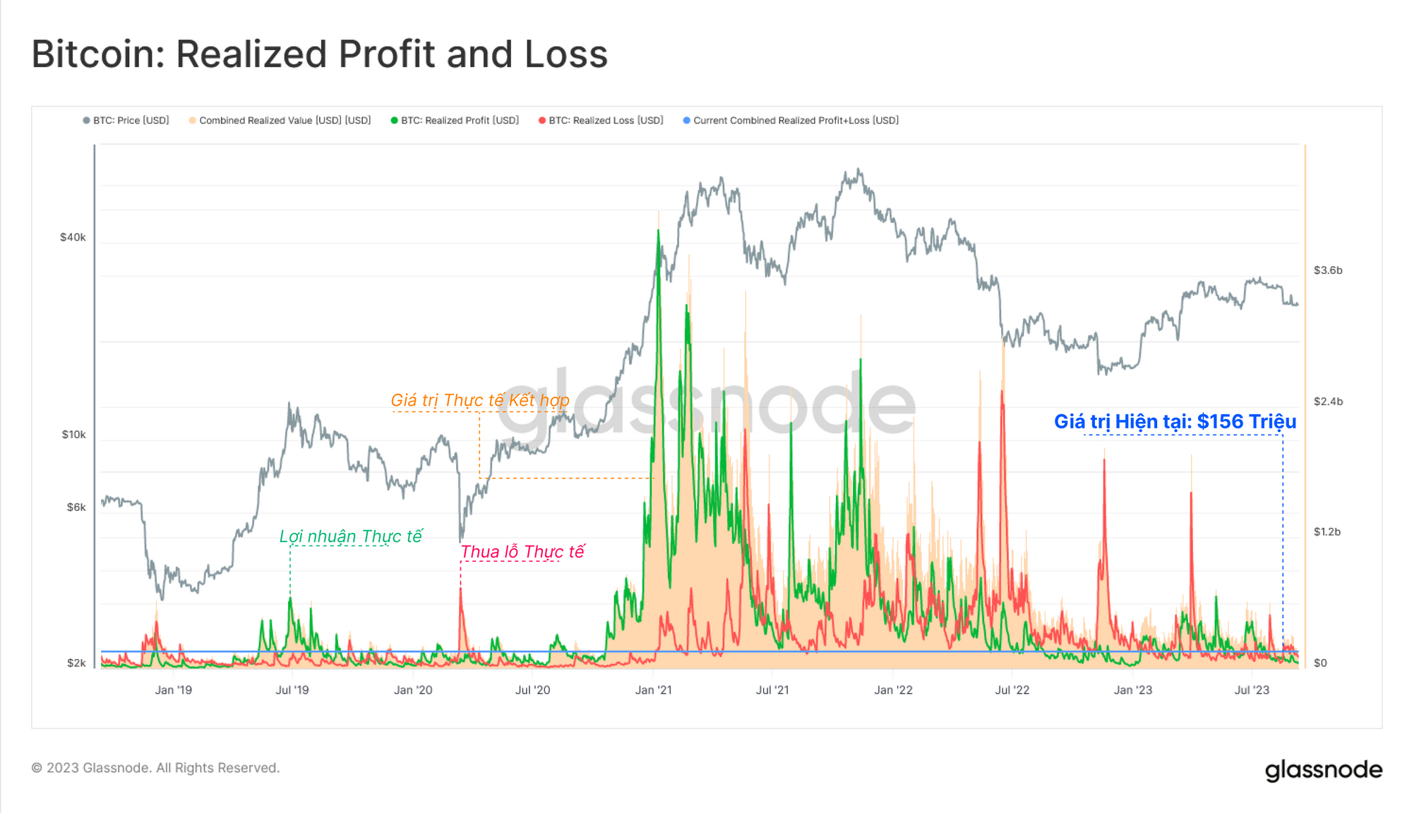 Nếu nhìn vào giá trị thực tế được giải quyết on-chain là sự khác biệt giữa giá mua lại và giá bán ra), chúng ta thấy rằng nó vẫn cực kỳ yên tĩnh. Nhìn chung, mức lãi hoặc lỗ bị khóa bởi thị trường là rất nhỏ, cho thấy phần lớn các đồng coin đang giao dịch đều gần với giá mua ban đầu của chúng.
