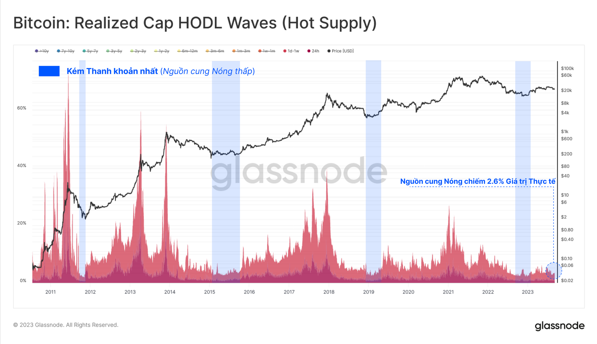 Giá trị Thực tế được giữ trong nhóm “Nguồn cung nóng” này nằm ở mức thấp lịch sử, cho thấy rằng hiện tại có rất ít BTC có tuổi đời hơn 1 tuần đang được giao dịch.