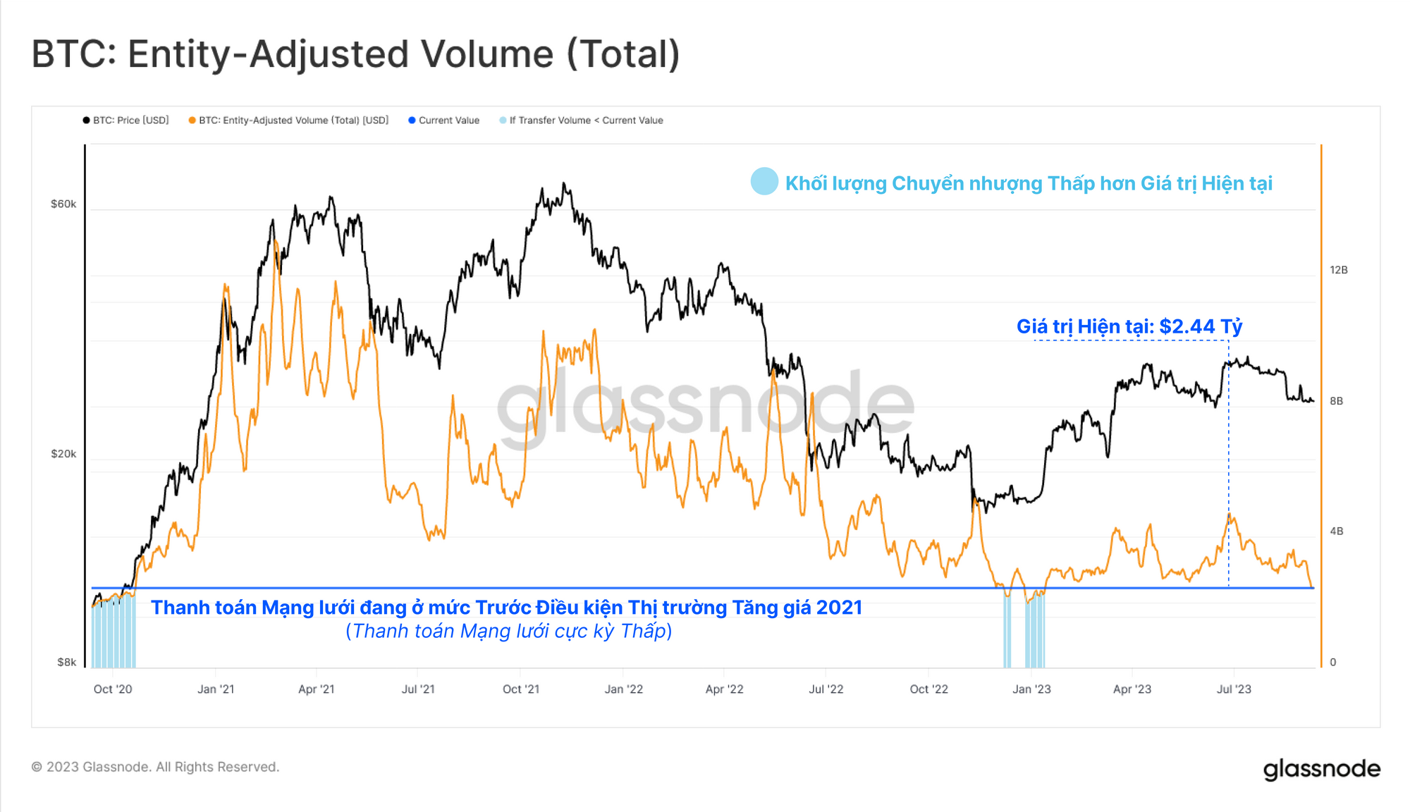 Môi trường thanh khoản thấp và biến động thấp này cũng được phản ánh qua khối lượng thanh toán của mạng Bitcoin. Tổng khối lượng USD của các đồng coin đổi chủ (sử dụng cụm entity-adjustment) đang giảm dần quanh mức đáy chu kỳ là 2.44 tỷ USD/ngày và đã quay trở lại mức của tháng 10 năm 2020.