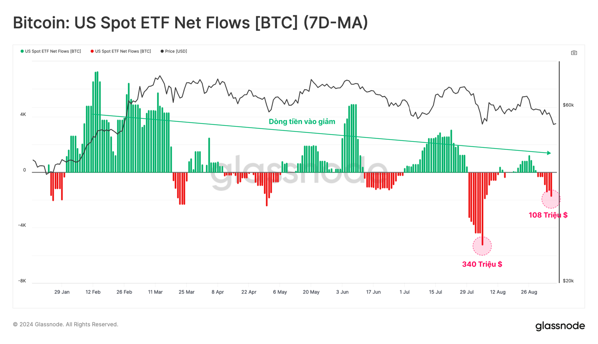 Cùng với đó, tương tác của Nhà đầu tư với các sàn giao dịch tiếp tục giảm, với khối lượng giao dịch giảm trên diện rộng, cho thấy nhu cầu từ các nhà đầu tư và giao dịch giảm. Điều này cũng được thể hiện rõ ràng đối với các Tổ chức, với các quỹ Bitcoin và Ethereum ETF đang chứng kiến dòng tiền chảy ra ròng.
