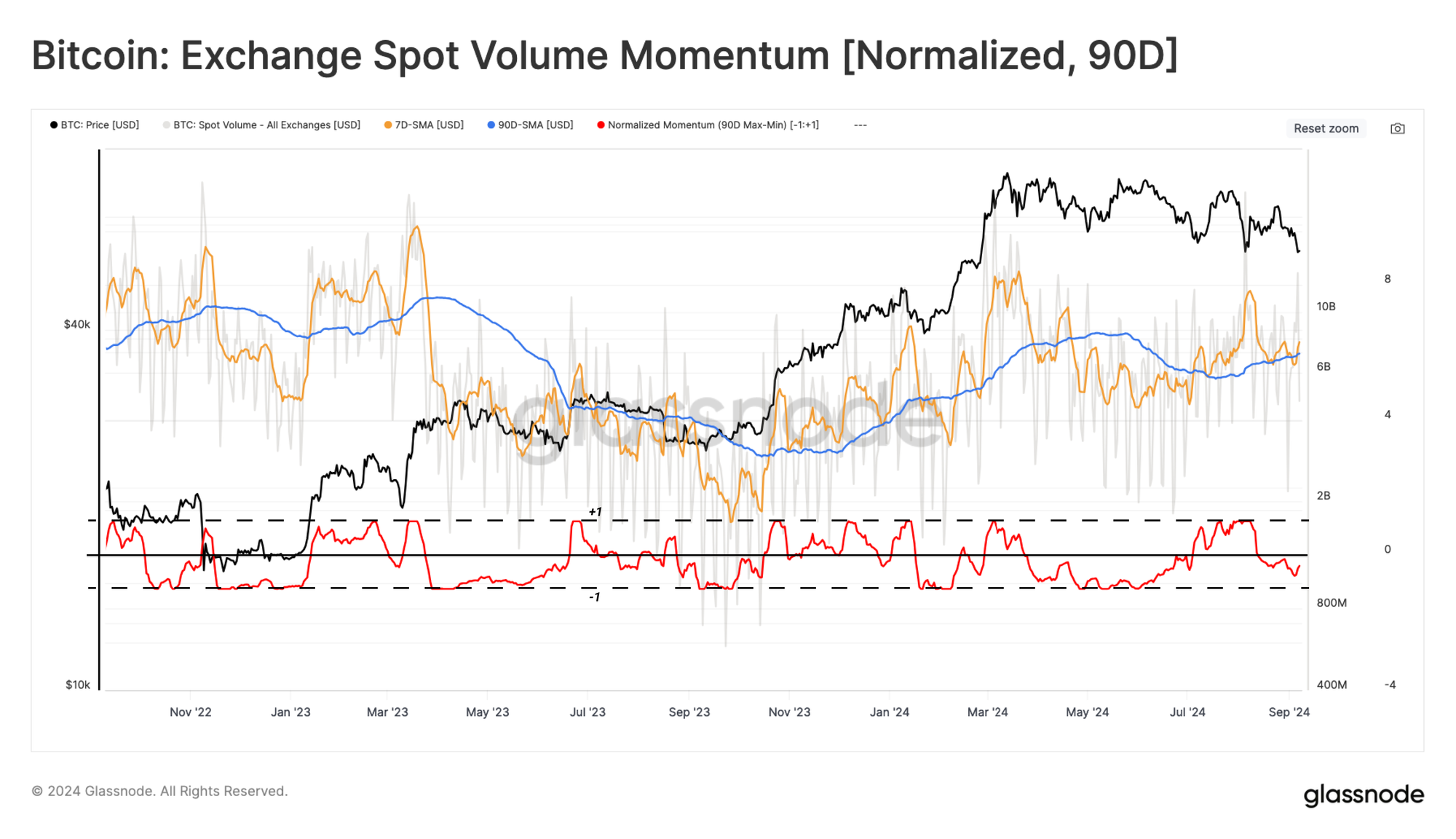 Tiếp theo, chúng tôi sẽ xem xét khối lượng giao dịch giao ngay tại các sàn giao dịch. Ở đây, chúng tôi áp dụng một giá trị vô hướng MinMax 90 ngày, nhằm chuẩn hóa giá trị được đặt trong phạm vi từ 1 đến -1 so với các giá trị tối đa và tối thiểu của giai đoạn đã chọn.