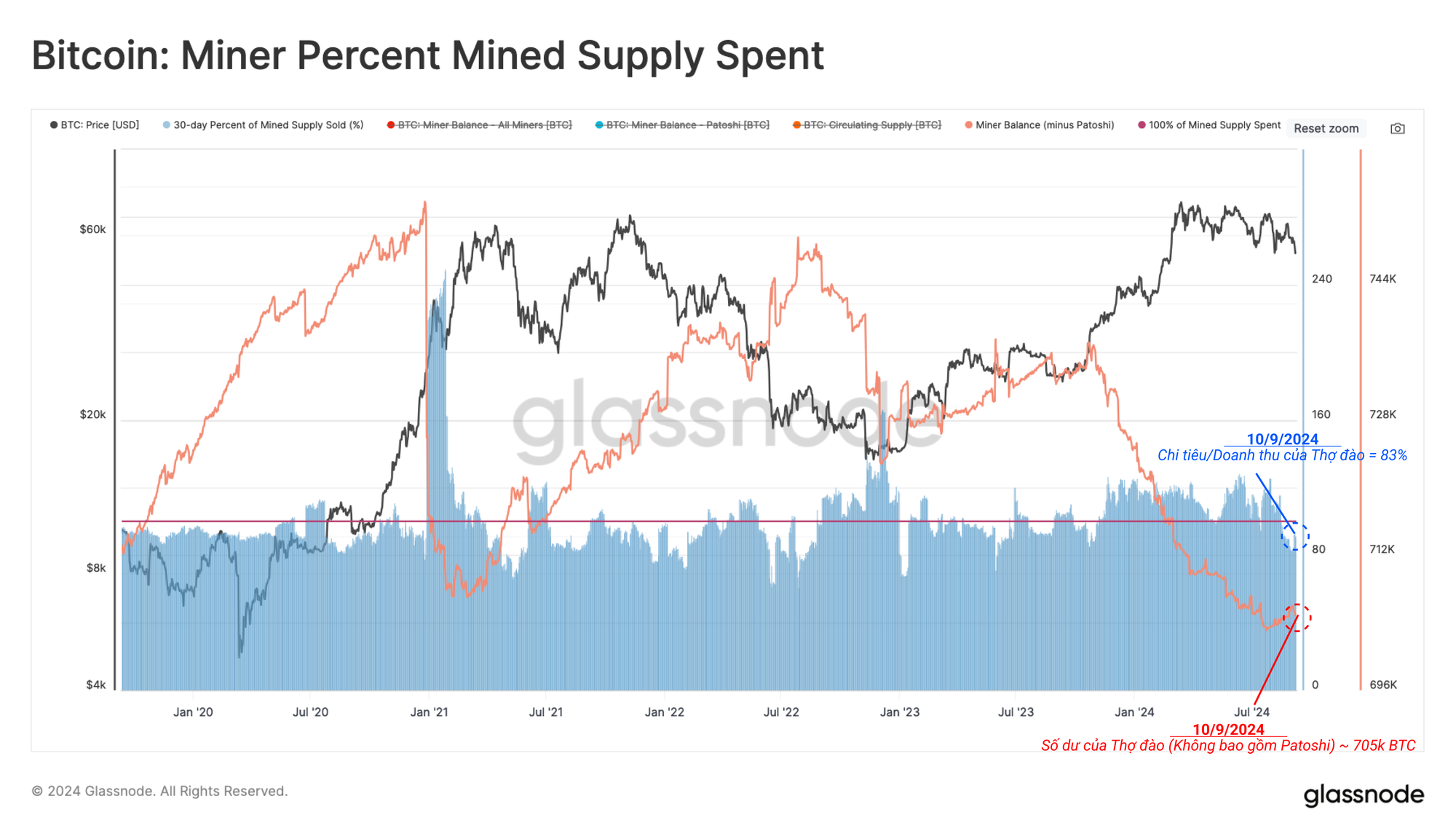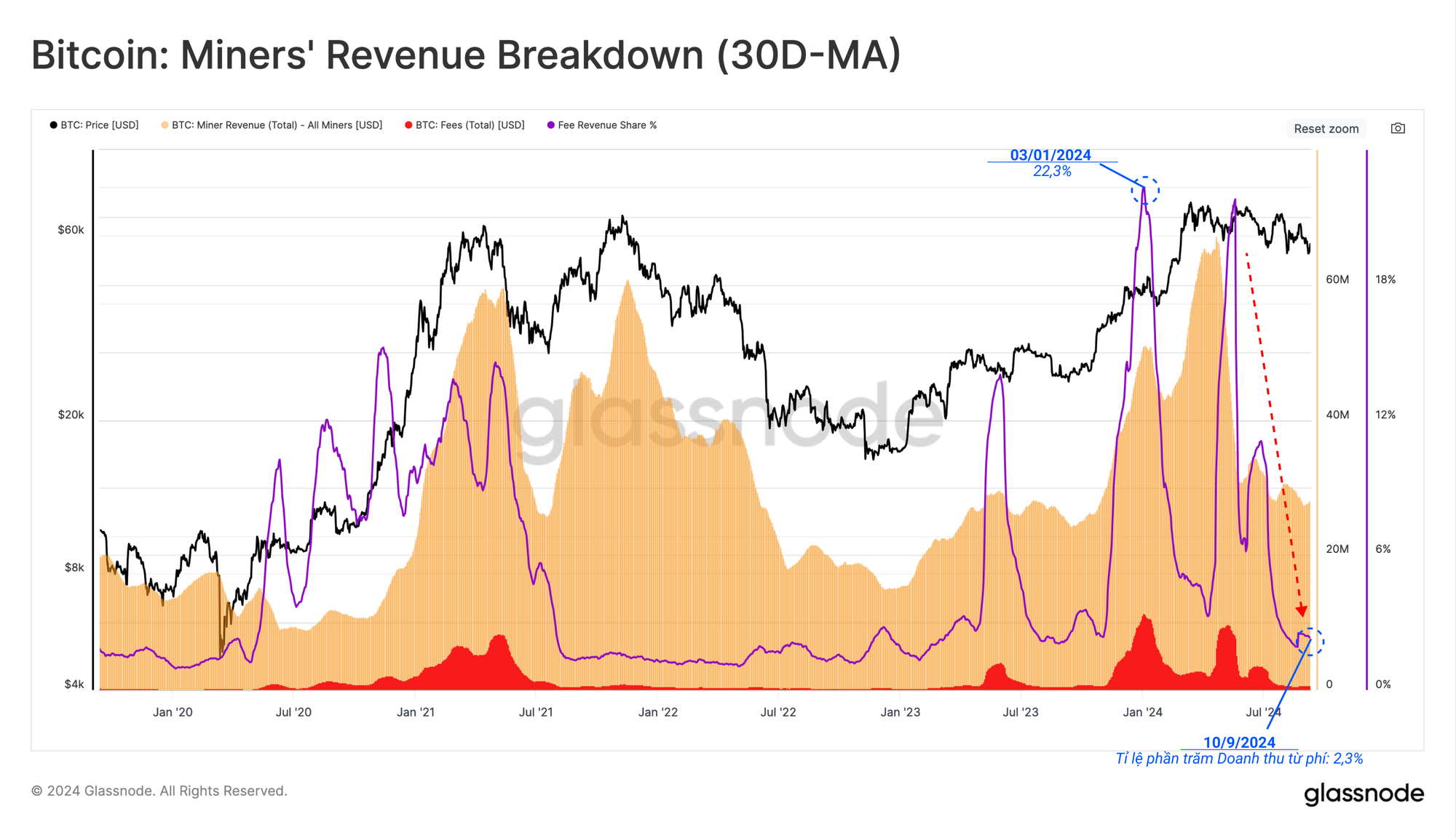Doanh thu thợ đào liên quan đến phần thưởng khối vẫn tương đối cao do giá giao ngay hiện giao dịch trên 55.000 USD, tuy nhiên, vẫn thấp hơn khoảng 22% so với ATH trước đó.
