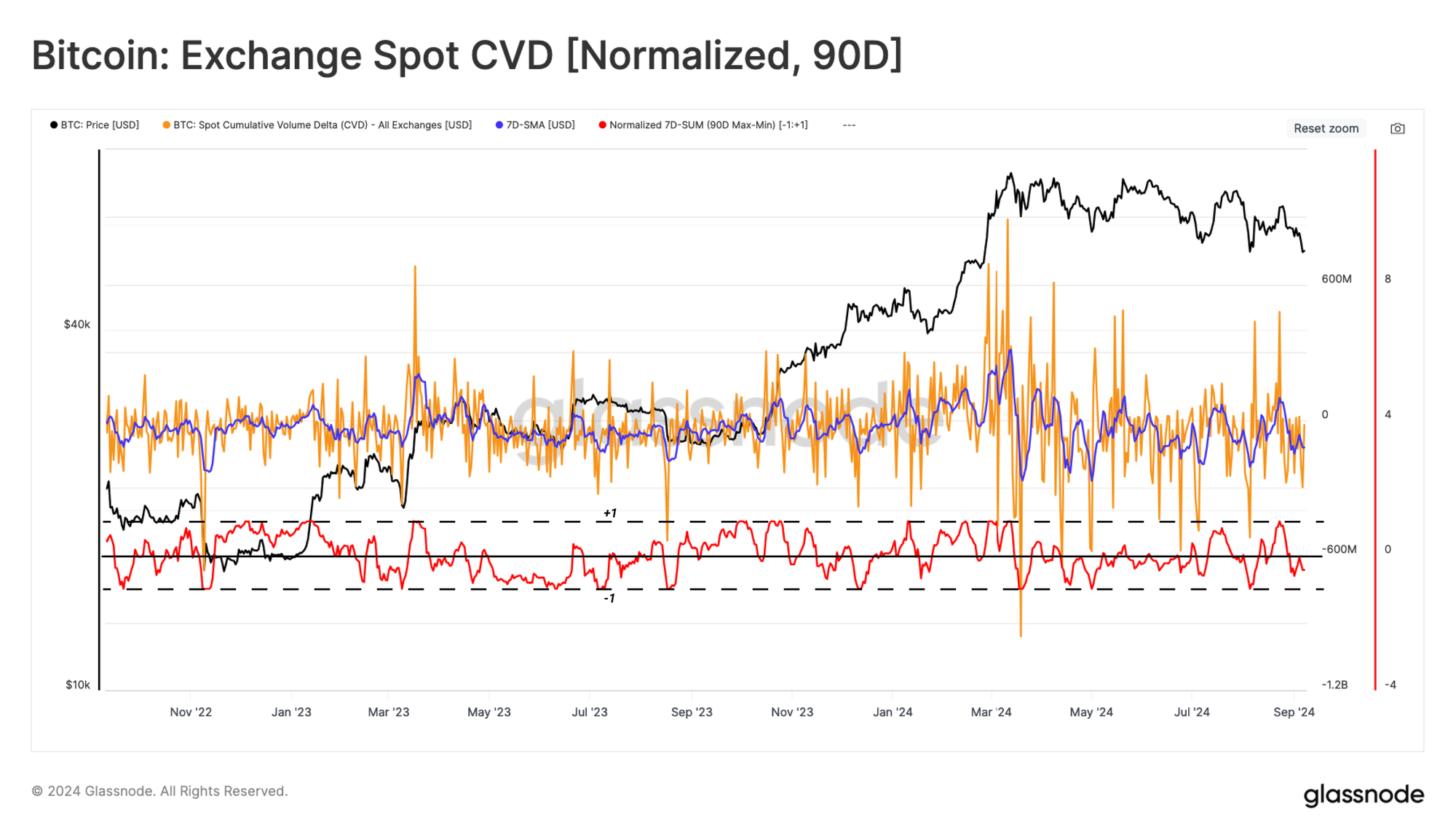 Chỉ số CVD có thể ước tính sự cân bằng ròng hiện tại giữa áp lực mua và bán trên thị trường giao ngay. Sử dụng cùng một phương pháp, chúng tôi nhận thấy rằng áp lực bán của nhà đầu tư đã tăng lên trong 90 ngày qua, góp phần vào xu hướng giảm trong hành động giá.