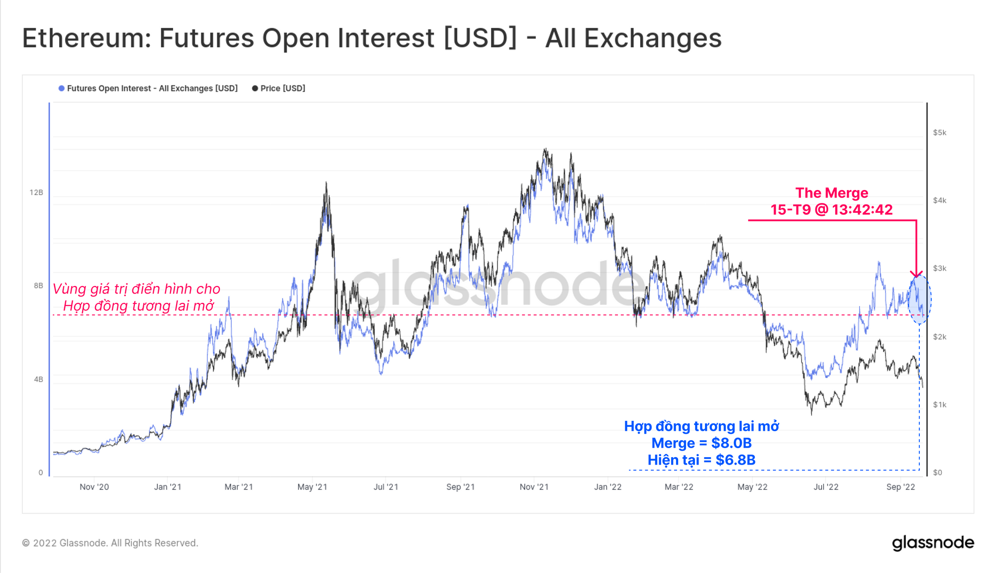 Tổng hợp đồng tương lai mở giảm 15% từ $8.0B xuống $6.8B sau the Merge chạm vào giá trị điển hình từ năm 2021 đến 2022. Tuy nhiên để duy trì được ở mức này, chúng ta cần phải tính đến sự thay đổi giá của ETH vì nó sẽ ảnh hưởng đến giá trị USD - cơ sở neo giá tính kích thước vị thế hợp đồng tương lai.