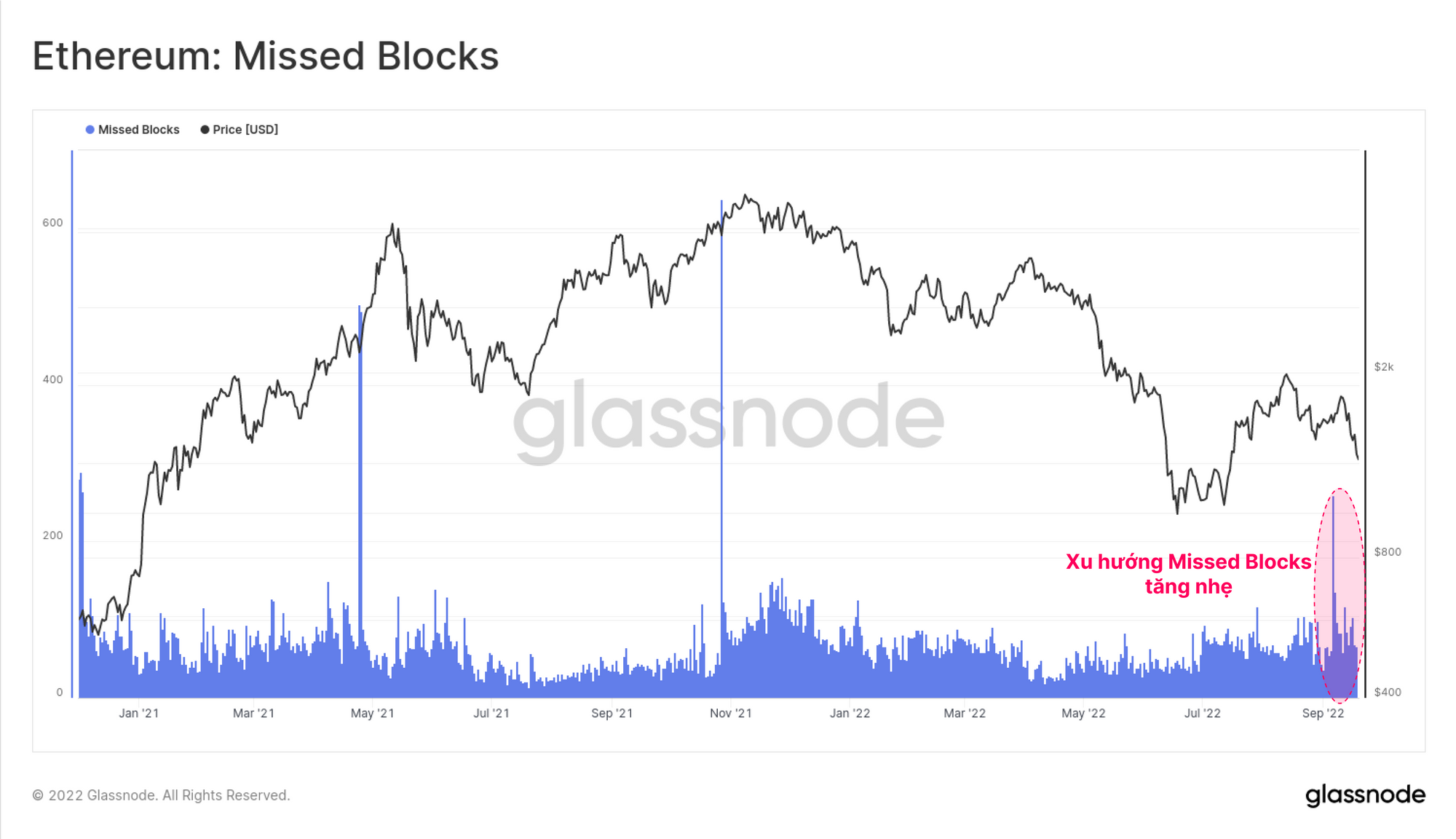 Trong những tuần trước khi diễn ra the Merge, Participation Rate có sự giảm nhẹ xuống dưới mức tiêu chuẩn, từ 99% xuống còn khoảng 97.5%. Sau Merge, chỉ số này đã trở lại trong phạm vi 99%+ cho thấy có sự gián đoạn ngắn với một số nhóm validators.