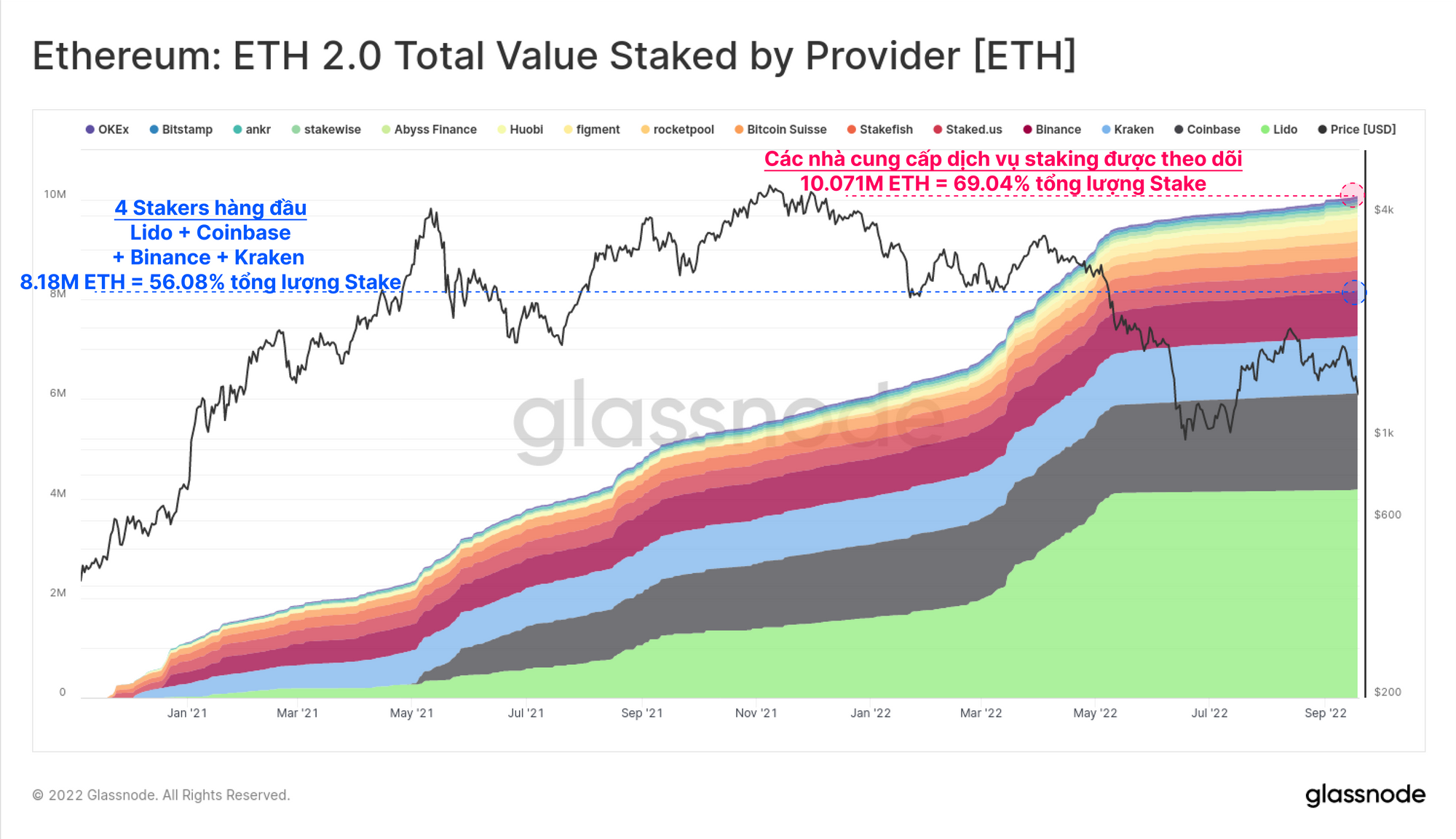 Phần lớn số ETH stake được quản lý bởi nhiều nhà cung cấp dịch vụ staking mà chúng tôi theo dõi, chiếm 10.071M ETH (69,04% tổng số). 4 nhà cung cấp dịch vụ hàng đầu là Lido, Coinbase, Kraken và Binance và tổng họ đã quản lý 8.18M ETH stake chiếm 56.08% tổng số.