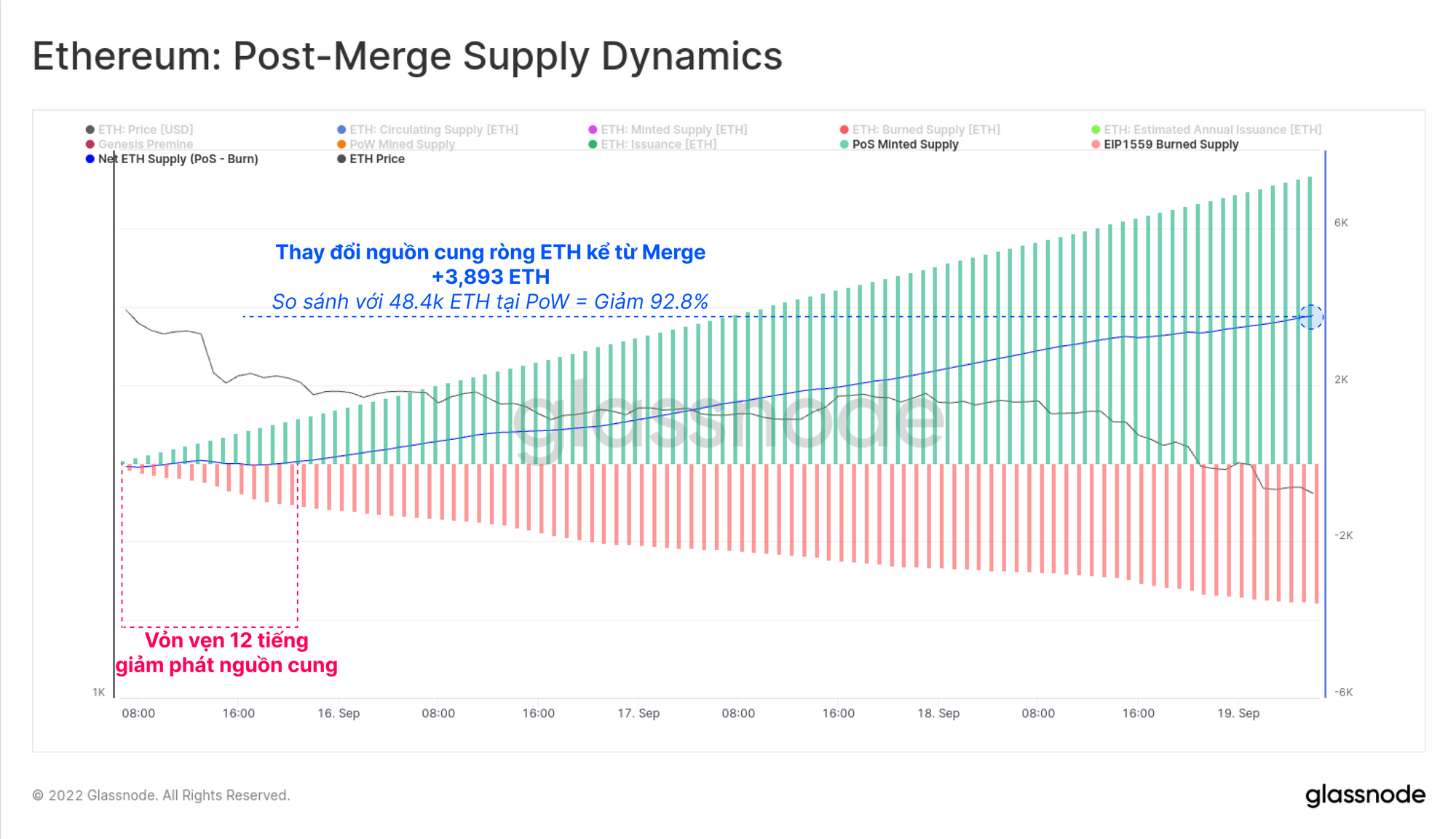 Ngay sau sự kiện the Merge, nhu cầu sủ dụng không gian trong block đã đẩy phí gas trung bình lên cao hơn dẫn tới khoảng 12 tiếng ban đầu nguồn cung ETH ròng trong tình trạng giảm phát. Tuy nhiên khi sự tắc nghẽn này giảm xuống và phí gas trở nên thấp hơn thì trên tổng thể, nguồn cung ETH đã tiếp tục tăng tuy nhiên tỷ lệ nhỏ hơn đáng kể so với việc triển khai PoW trước đây.