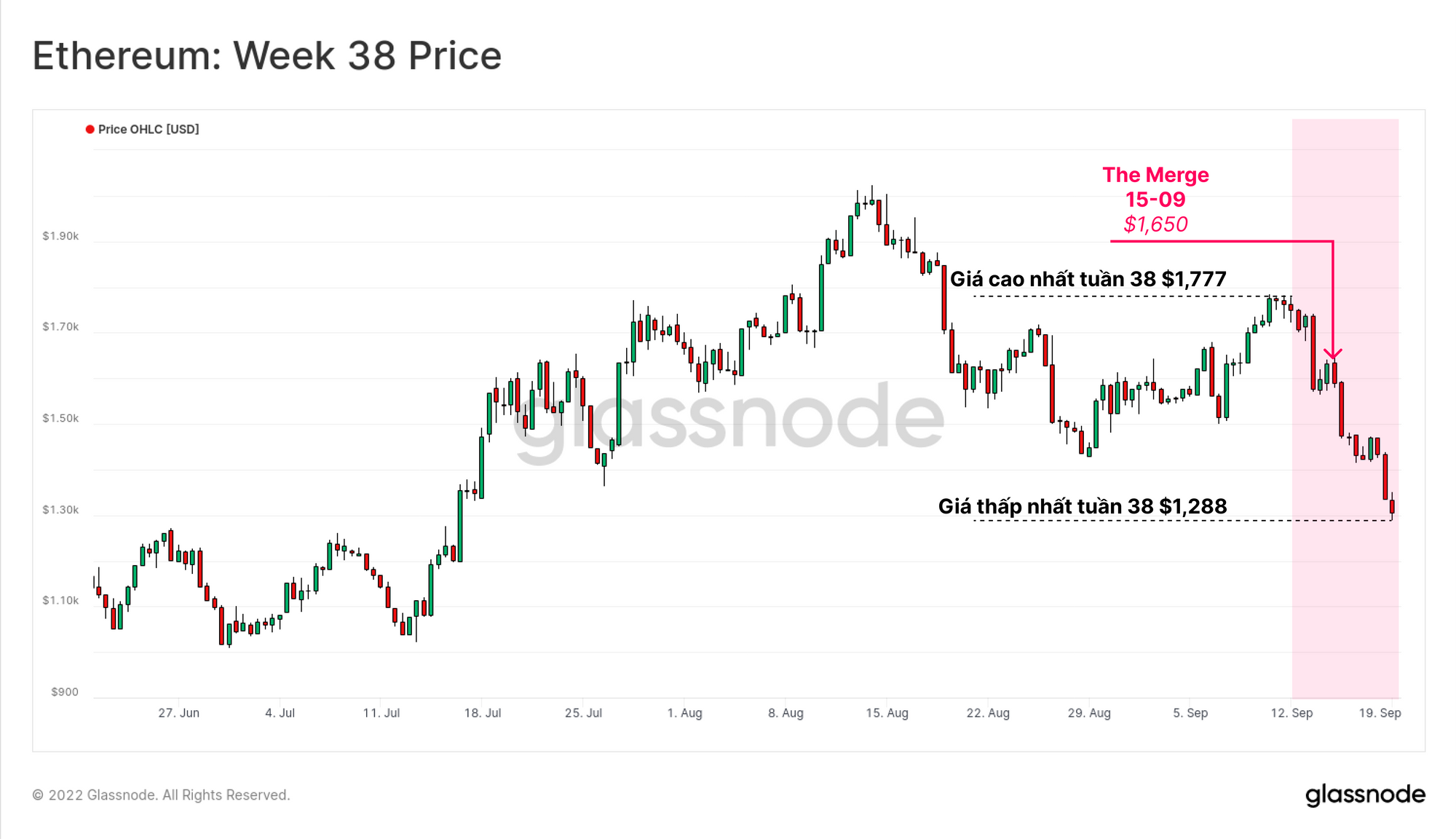 Trong WoC 32 Report, chúng tôi đã mô tả việc xuất hiện các vị thế trên thị trường hợp đồng tương lai và hợp đồng quyền chọn như là một biện pháp phòng ngừa rủi ro cho sự kiện sell-the-news. Thật vậy, ETH đã bị bán tháo từ mức cao nhất của tuần $1,777 xuống còn khoảng $1,650 ngay khi the Merge diễn ra và đổ xuống mức thấp nhất tuần $1,288 vào chủ nhật.