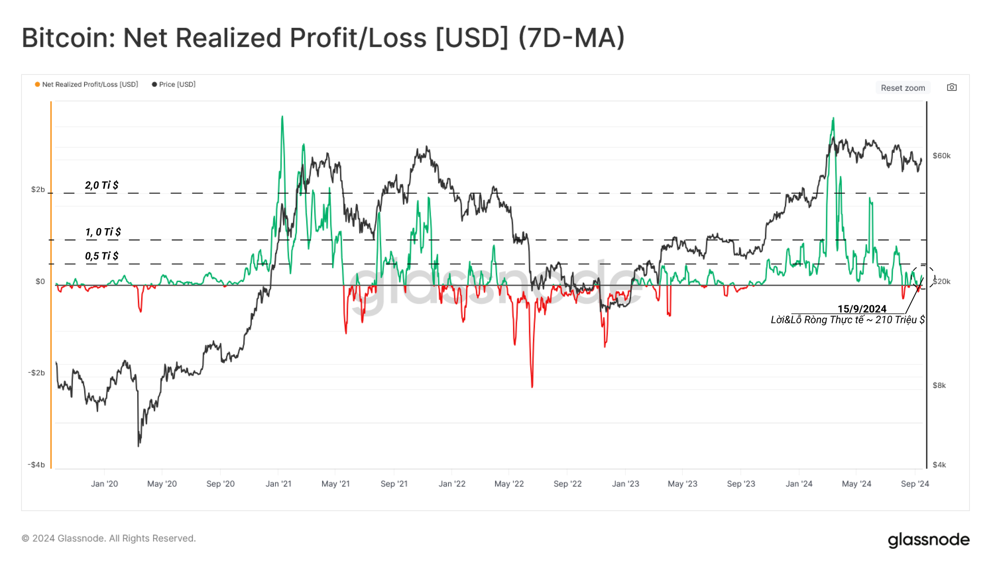Hiện tại, cả bên lãi và lỗ đều có độ lớn bằng nhau, dẫn đến dòng tiền ròng không đáng kể và dao động quanh giới hạn bằng không. Điều này ám chỉ đến một mức độ cân bằng đang được thiết lập trên thị trường và có một số điểm tương đồng với giai đoạn tháng 8-tháng 9 năm 2023.