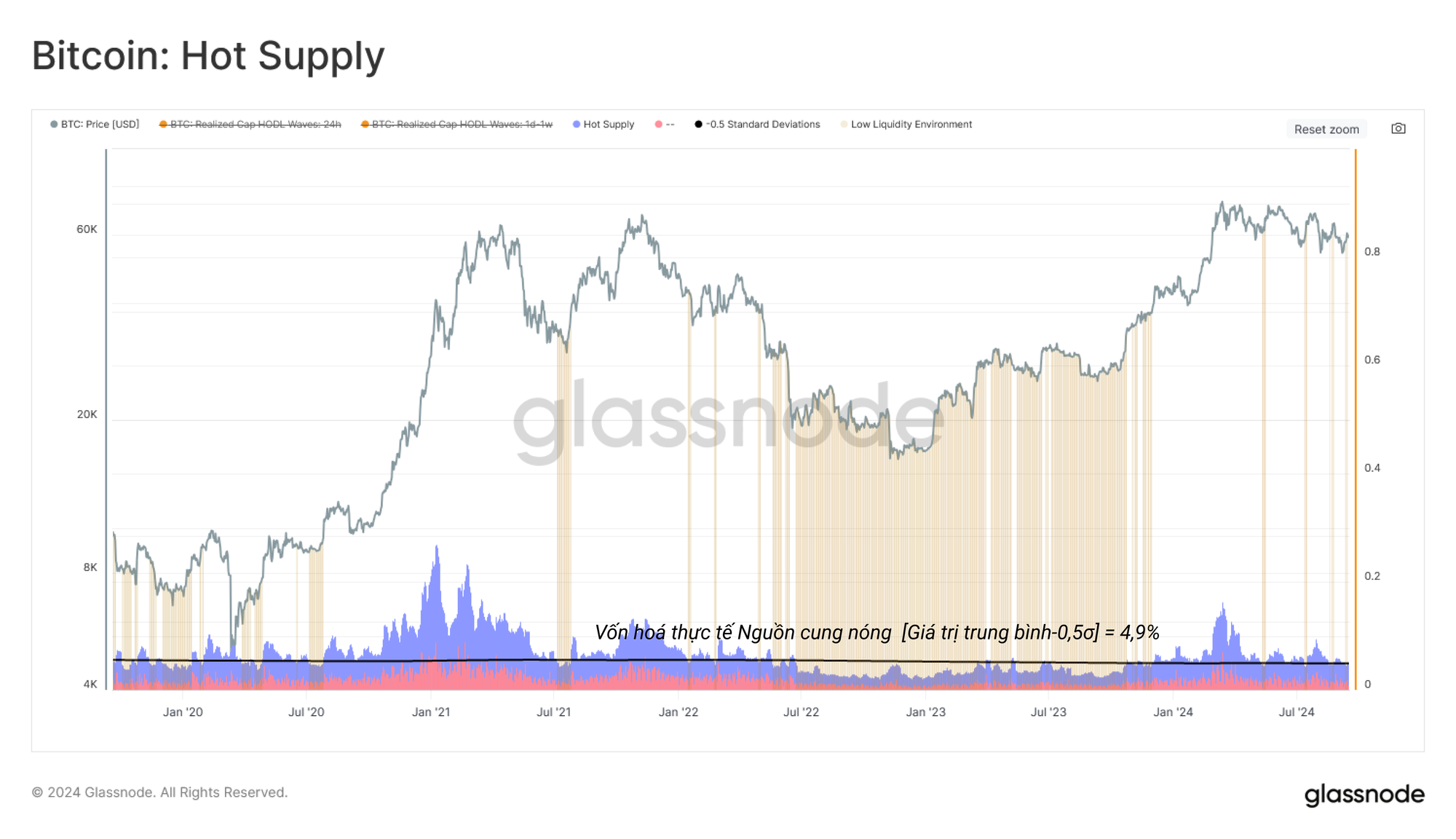 Chỉ số “Nguồn cung nóng” là một đại diện mà chúng tôi sử dụng để ước tính các đồng coin sẵn sàng để giao dịch và chuyển nhượng. Khối lượng nguồn cung này đại diện cho tài sản được nắm giữ trong các đồng coin có tuổi đời từ một tuần trở xuống. Dựa trên giả định rằng thời gian nắm giữ ngắn trên thị trường làm tăng khả năng đồng coin sẽ được giao dịch trở lại, như đã được phát hiện trong nghiên cứu của chúng tôi về Người nắm giữ dài hạn và ngắn hạn, chúng tôi coi nhóm tuổi riêng biệt này là một trong những nhóm sẵn sàng ứng phó với những biến động của thị trường nhất.