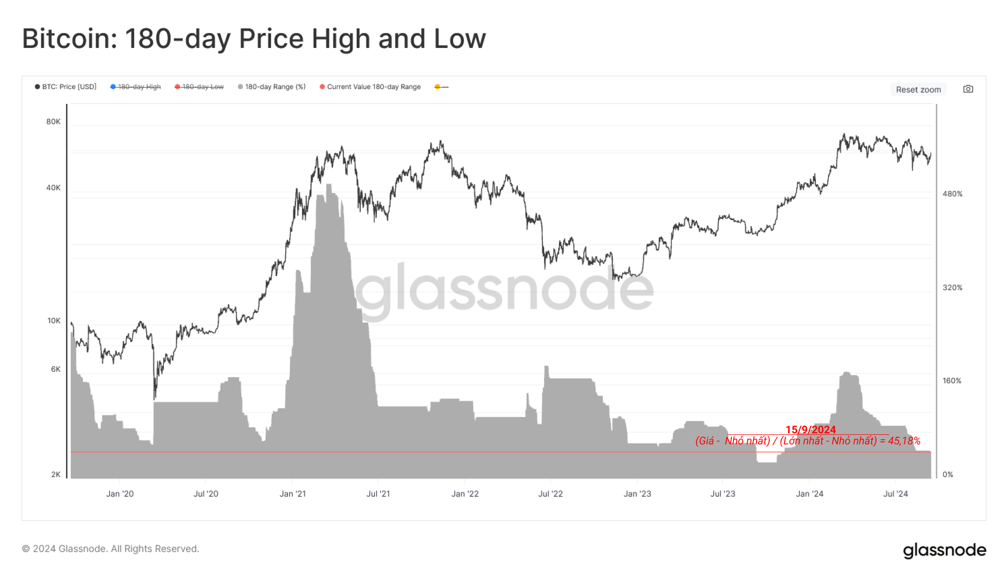 Độ nén biến động thị trường có thể được phán đoán bằng cách đo phạm vi phần trăm giữa các mức giá cao nhất và thấp nhất trong 180 ngày qua. Theo số liệu này, chỉ có tháng 8 năm 2023 và tháng 5 năm 2016 thể hiện phạm vi giá 180 ngày hẹp hơn. Điều này làm nổi bật sự thắt chặt tương đối của cấu trúc thị trường hiện tại.