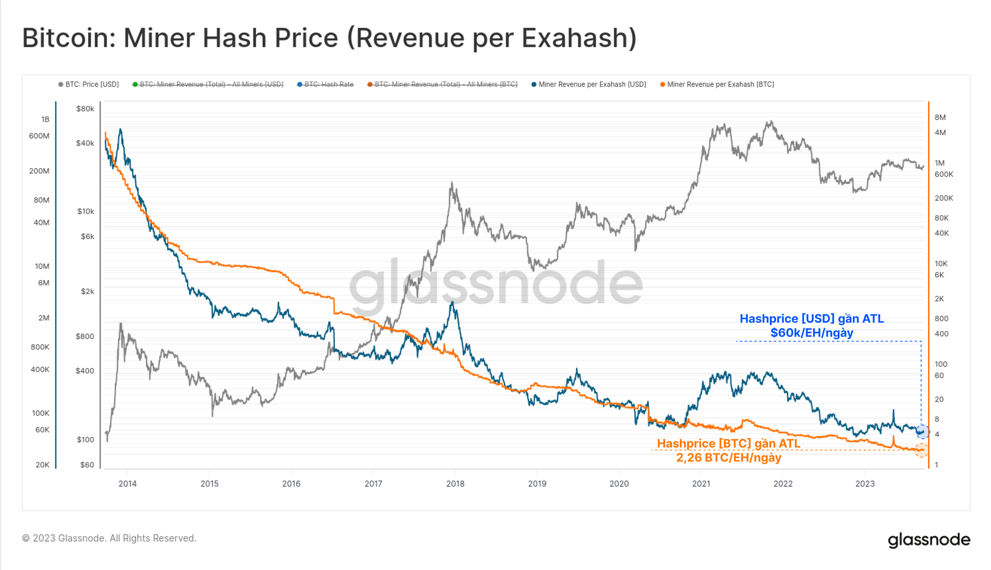 Điều này đã thúc đẩy hashprice, là phần thưởng BTC hoặc USD kiếm được trên mỗi Exahash, hướng tới mức thấp mới mọi thời đại. Những người khai thác giờ đây sẽ chỉ kiếm được 2,26 BTC (~ $60k) cho mỗi Exahash hoạt động trên mạng.