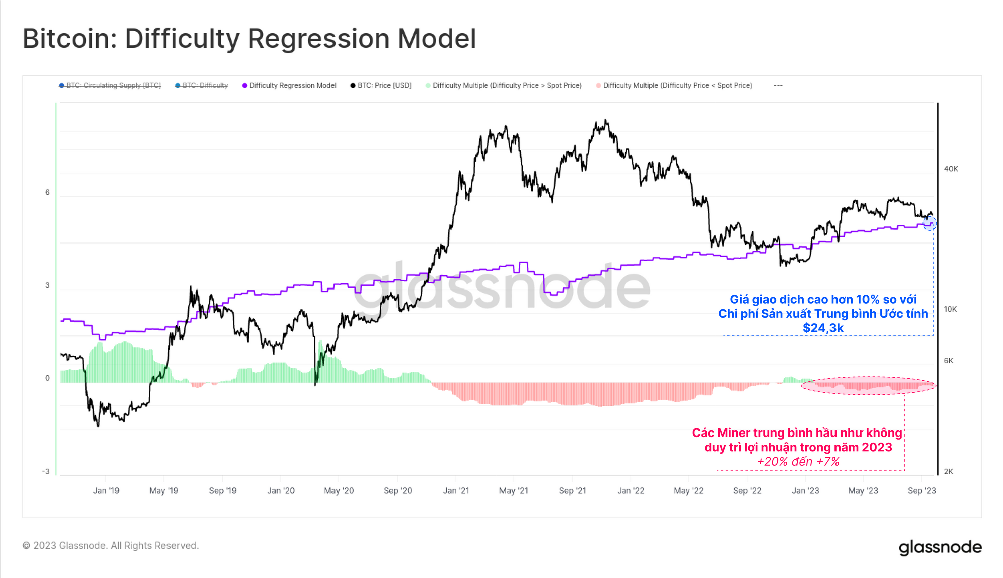 Trong một nghiên cứu trước đây, chúng tôi đã cố gắng ước tính tổng chi phí sản xuất trung bình cho BTC thông qua mô hình hồi quy giữa Vốn hóa Thị trường và độ khó đào. Dựa trên mô hình này, chi phí sản xuất trung bình là khoảng $24,3k, thấp hơn 10% so với giá giao ngay hiện tại.