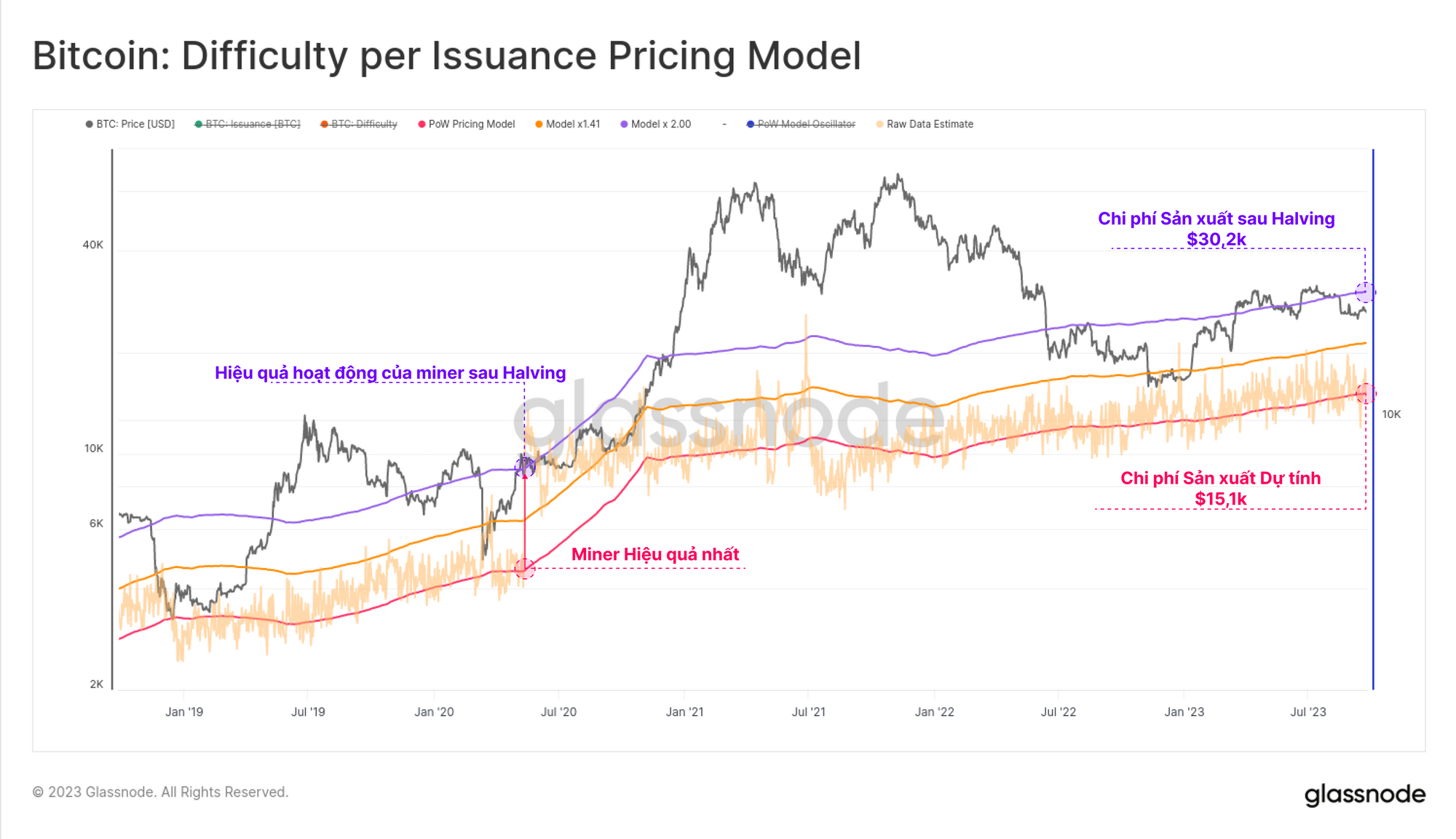 Tuy nhiên, đường cong màu tím cho thấy mức này “tăng gấp đôi” sau halving lên $30,2k, điều này có thể sẽ khiến phần lớn thị trường khai thác rơi vào tình trạng căng thẳng nghiêm trọng về thu nhập.