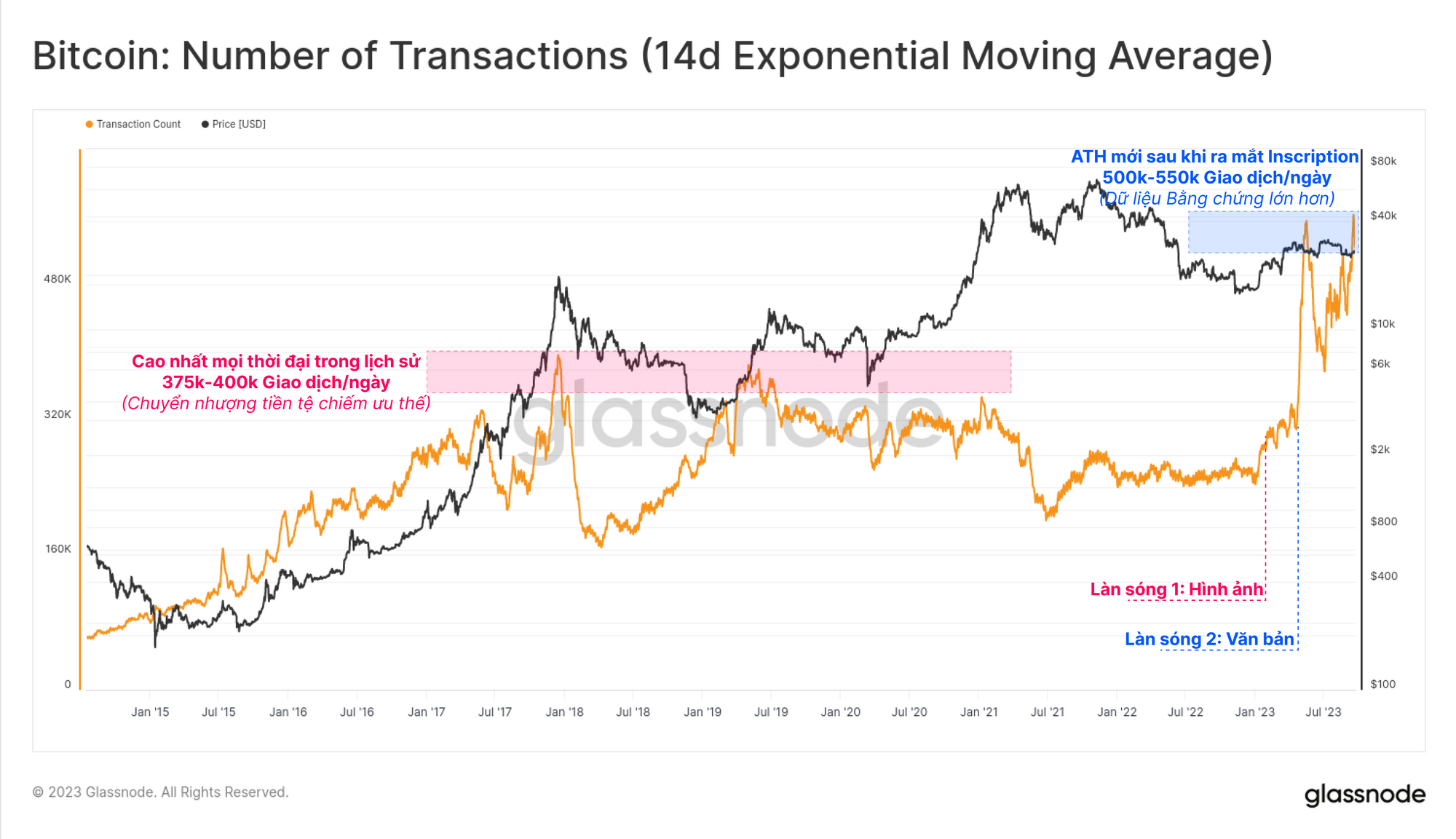 Tuy nhiên, năm 2023 đã chứng kiến sự gia tăng đáng kinh ngạc về số lượng giao dịch được xác nhận hàng ngày, vượt mức 550k mỗi ngày trong cả tháng 5 và một lần nữa trong tuần này.