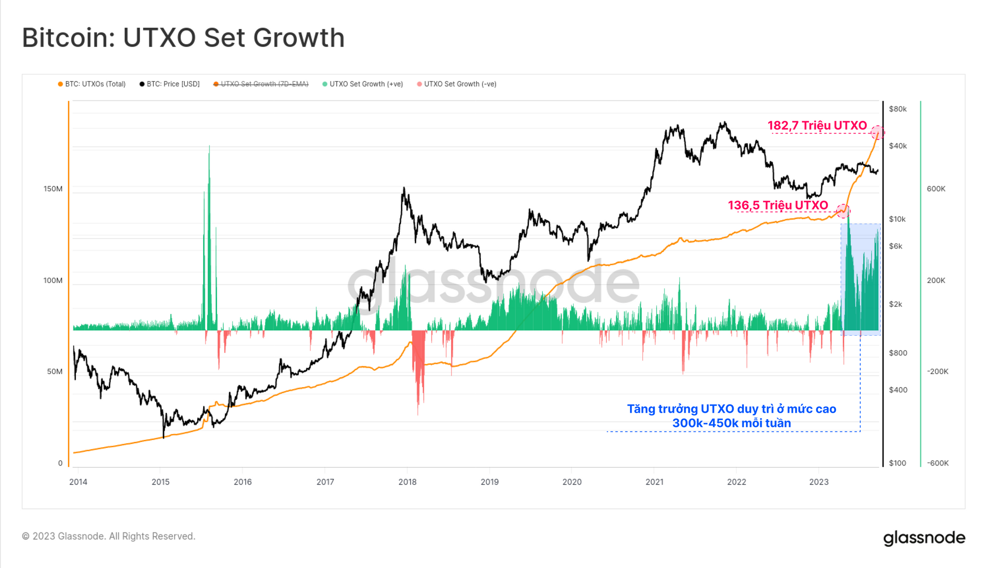 Một tác động đáng chú ý của inscription là bộ UTXO đang mở rộng nhanh chóng. Kể từ tháng 2, tổng số UTXO đã tăng thêm +46,2 triệu (+33,8%). Đây là tốc độ tăng hàng tuần lớn nhất trong lịch sử, duy trì mức từ 300k đến 450k UTXO/tuần trong hơn sáu tháng.