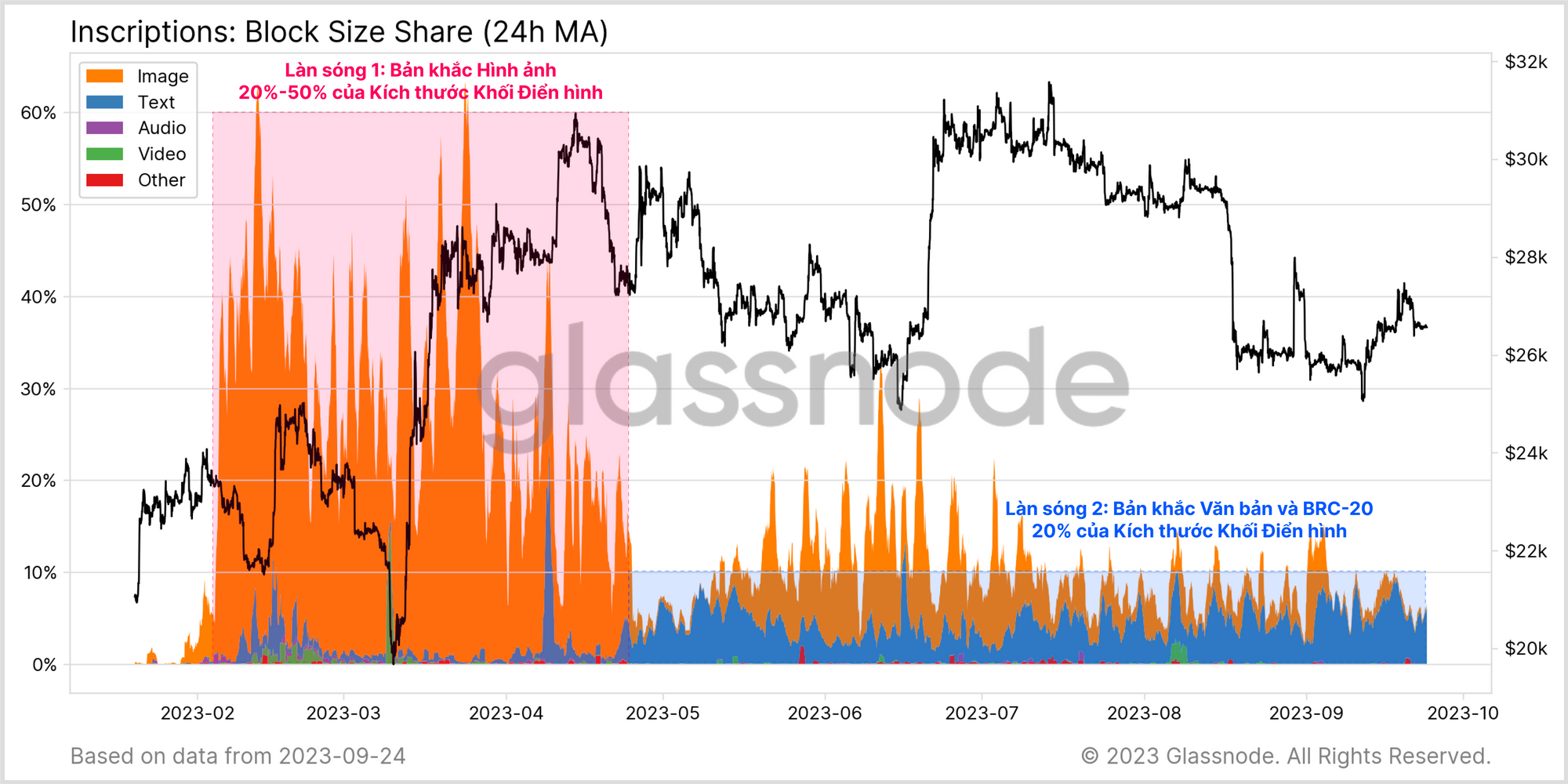 Inscription (Bản khắc) cho phép người dùng Bitcoin mã hóa các tệp vào phần bằng chứng của cấu trúc dữ liệu giao dịch. Biểu đồ dưới đây cho thấy cho đến nay đã có hai làn sóng inscription:
