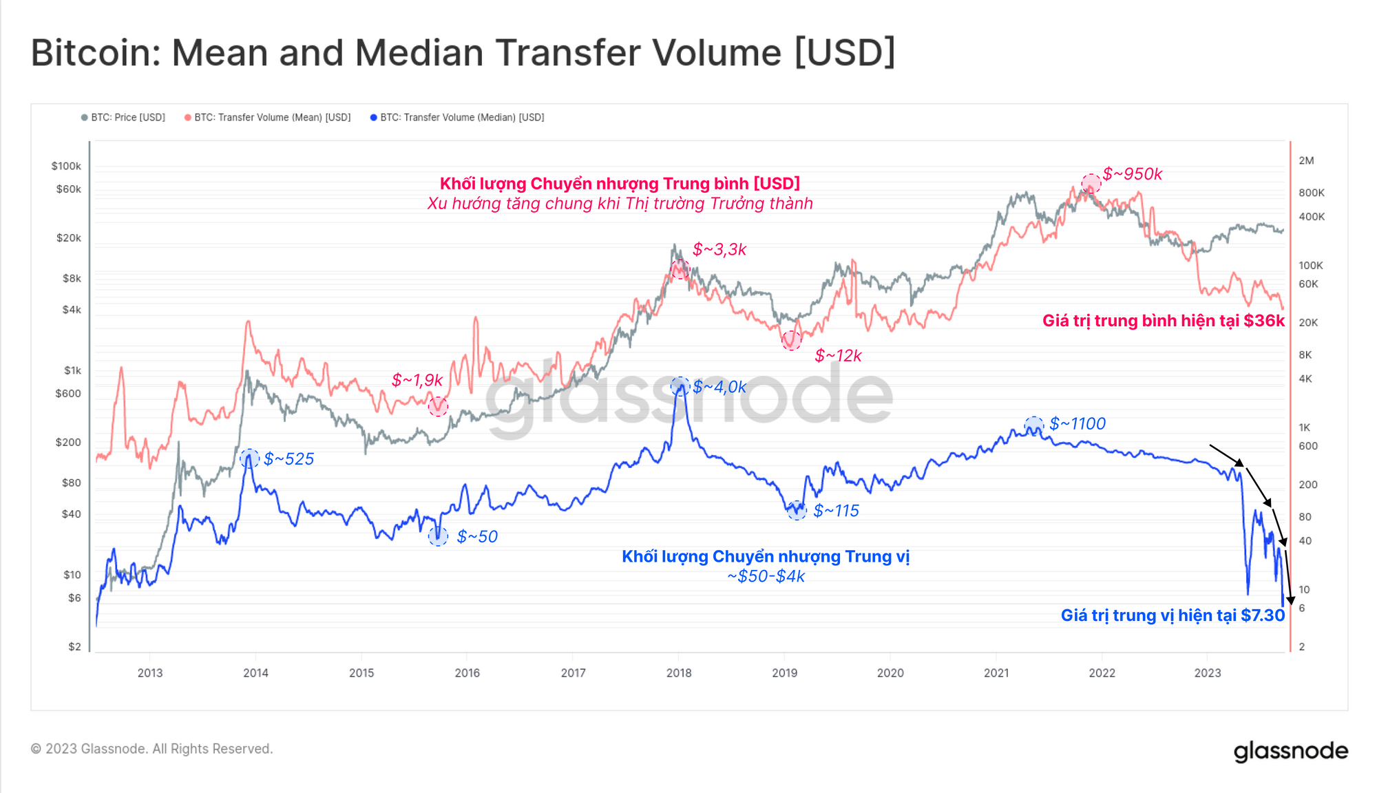 - 🔵 Khối lượng Chuyển nhượng Trung vị đại diện nhiều hơn cho các nhà đầu tư nhỏ hơn (trong lịch sử) và trong thời gian gần đây là các bản khắc (năm 2023).