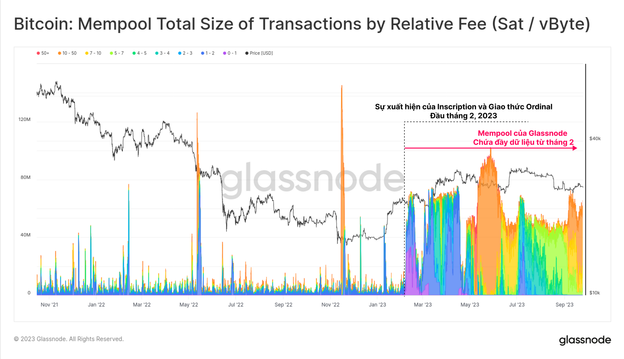 Biểu đồ bên dưới hiển thị kích thước dữ liệu của các giao dịch trả phí cao nhất trong mempool Glassnode trong năm qua. Đáng chú ý là sự gia tăng đáng kể về nhu cầu không gian khối đã bắt đầu vào tháng 2, phù hợp với việc ra mắt Ordinals và Inscriptions. Nhu cầu tăng cao này đã được duy trì kể từ đó.