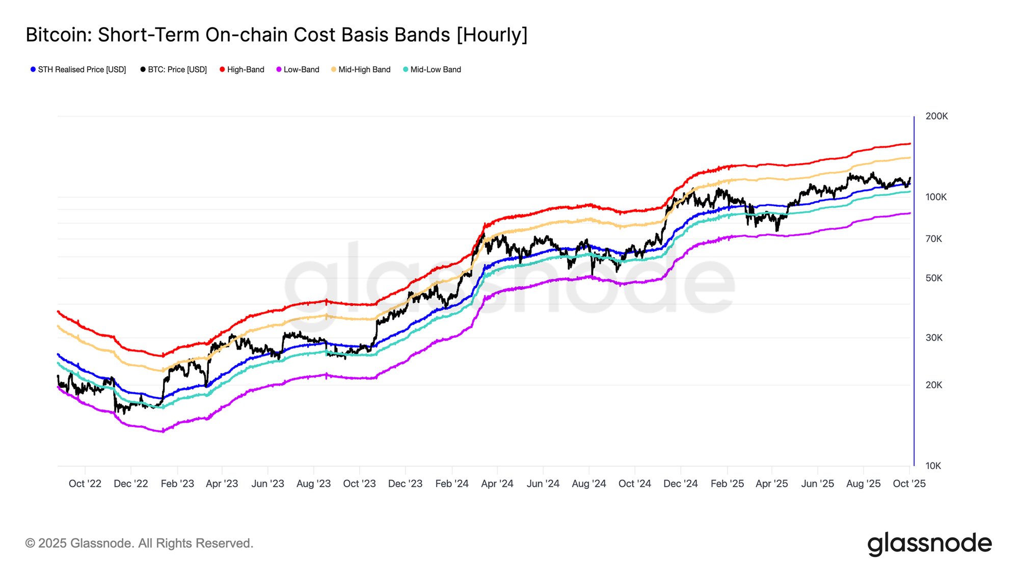 Tiếp nối đà phục hồi này, cơ sở chi phí của STH một lần nữa nổi lên như một như một điểm xoay chiều then chốt. Kể từ tháng 5 năm 2025, mức này đã đóng vai trò hỗ trợ trong năm lần riêng biệt, nhấn mạnh vai trò của nó như một ranh giới phân định giữa các giai đoạn tăng giá và giảm giá.