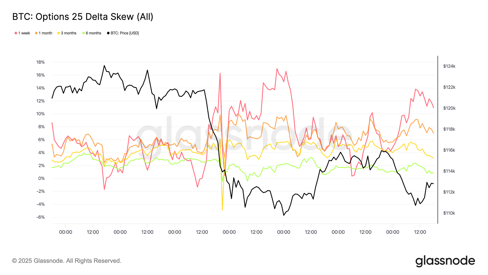 Sau đợt biến động cực độ, sự chú ý chuyển sang độ lệch quyền chọn, nơi ghi lại một cách rõ rệt hành động tìm nơi trú ẩn của các nhà giao dịch. Độ lệch 25 delta (tính bằng Giá Put - Giá Call) đã bùng nổ trên tất cả các kỳ hạn đáo hạn sau đợt thanh lý lớn nhất trong lịch sử quyền chọn BTC, khi nhu cầu phòng hộ rủi ro giảm giá tăng vọt.