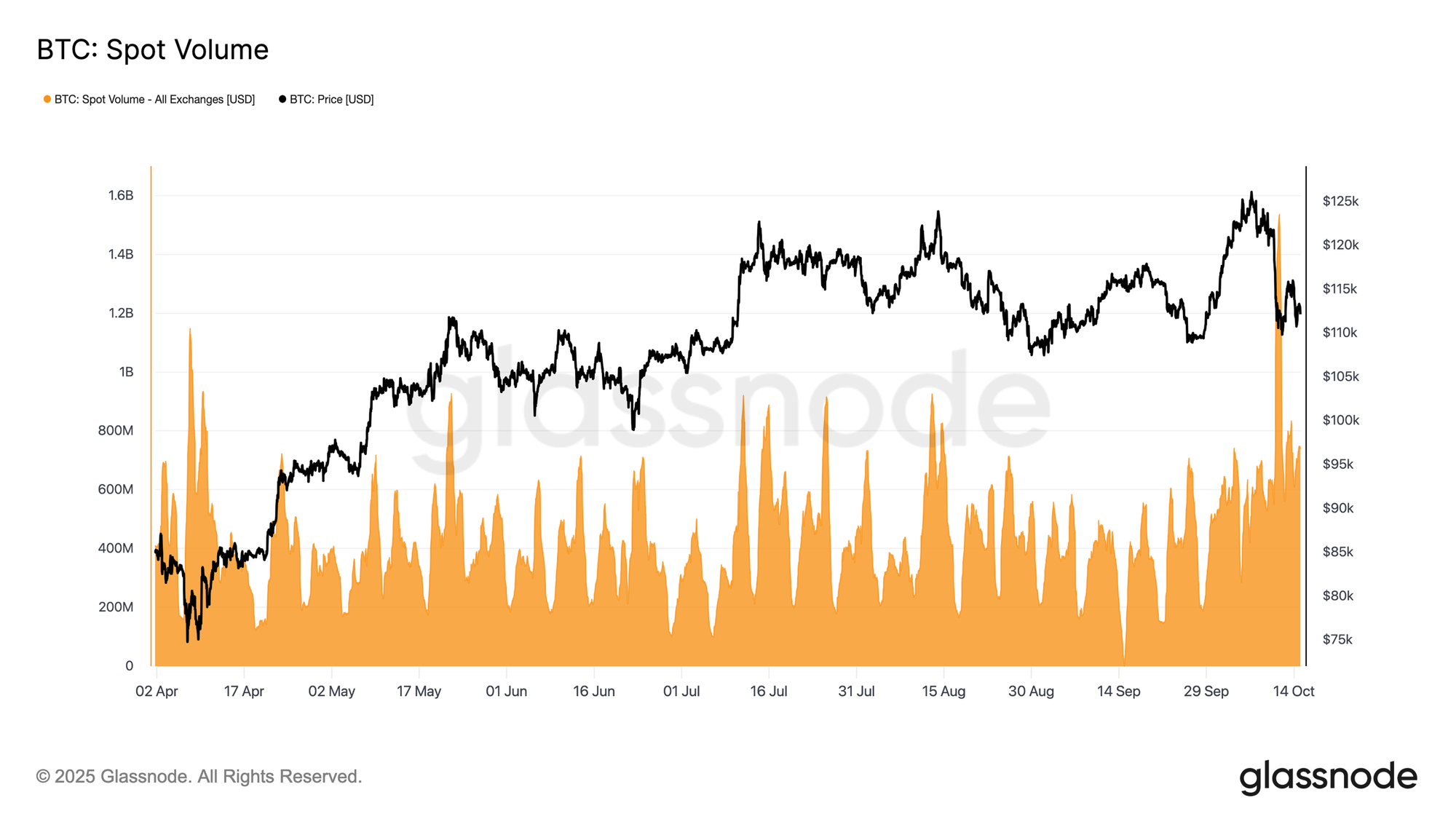 Trong đợt thanh lý gần đây, khối lượng giao dịch giao ngay đã tăng mạnh, đánh dấu một trong những mức cao nhất được ghi nhận trong năm nay. Sự tăng đột biến này phản ánh hoạt động thị trường mạnh mẽ khi các nhà giao dịch vội vàng điều chỉnh vị thế trong bối cảnh biến động gia tăng.