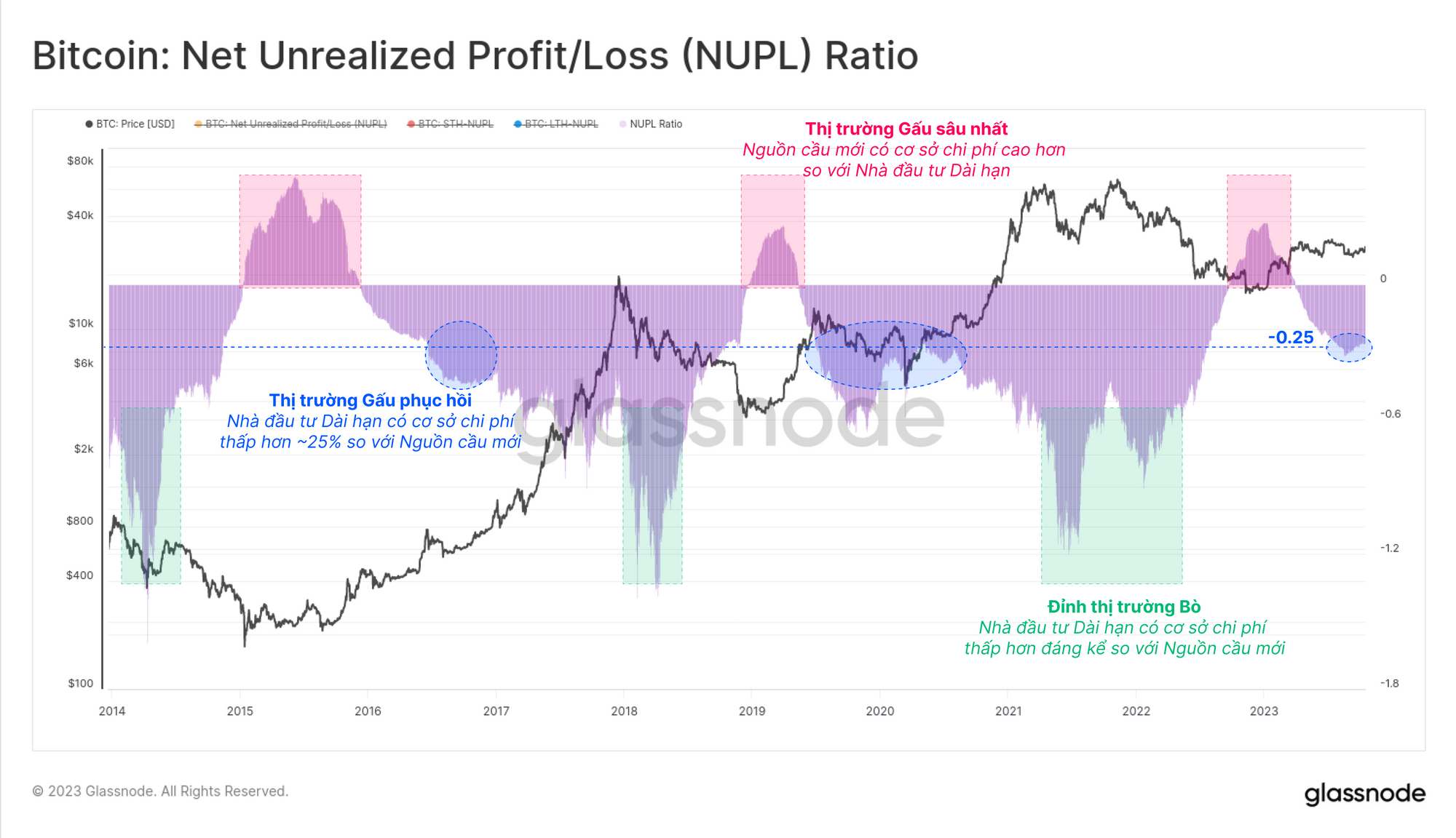 NUPL Ratio 🟪 cung cấp một chỉ báo hiệu quả để điều hướng các chu kỳ thị trường dựa trên xu hướng trong các thành phần Nguồn cung Hiện tại (Nhà đầu tư dài hạn) so với Nhu cầu mới (Nhà đầu tư ngắn hạn). NUPL Ratio đã bước vào phạm vi -0.25 trong quý 3 năm 2023, tương tự như giai đoạn 2016 và 2019 và là điển hình của giai đoạn phục hồi trong thị trường gấu.