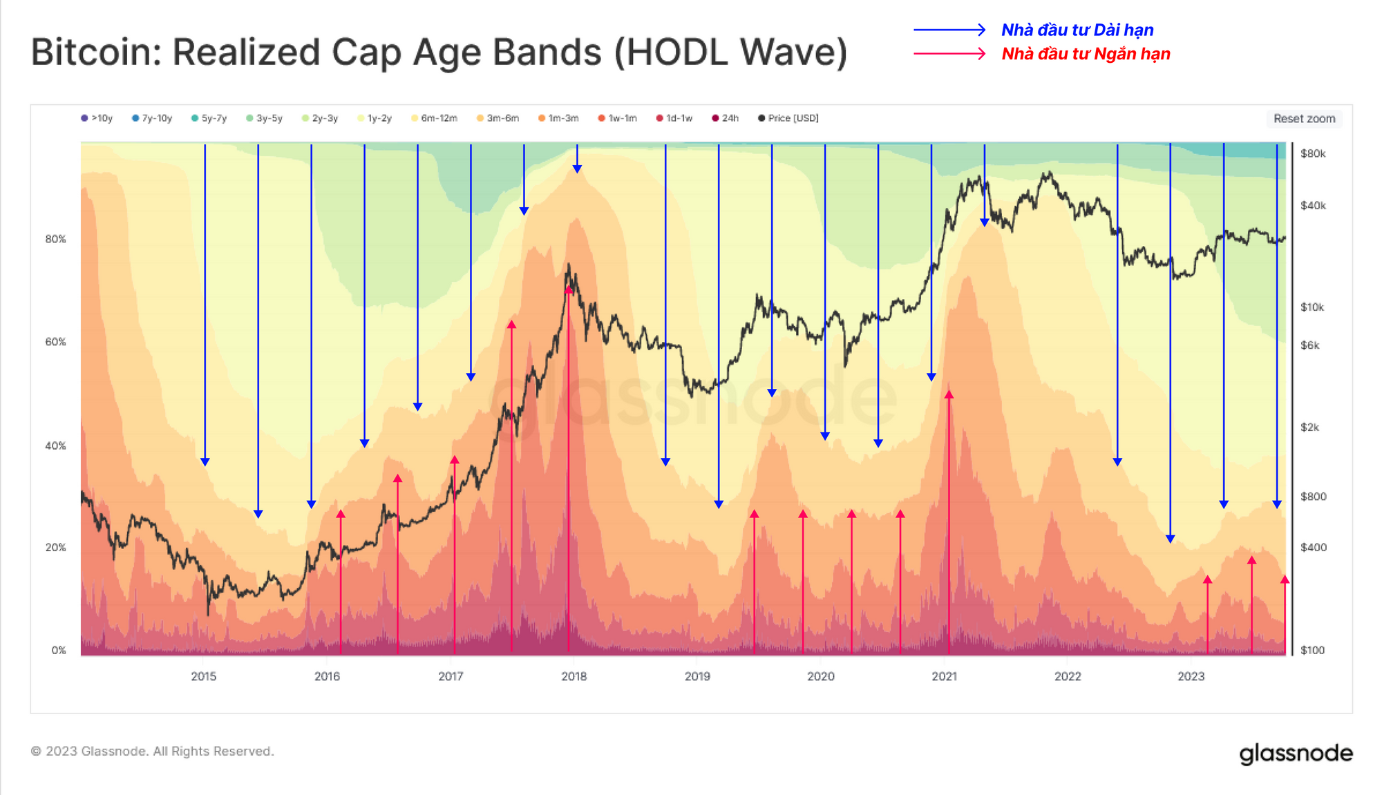 - 🔵 Trong xu hướng thị trường tăng giá các đồng coin cũ hơn được chi tiêu và chuyển từ những người nắm giữ dài hạn sang các nhà đầu tư mới hơn (các dải màu ấm hơn mở rộng, dải màu lạnh hơn thu hẹp lại).