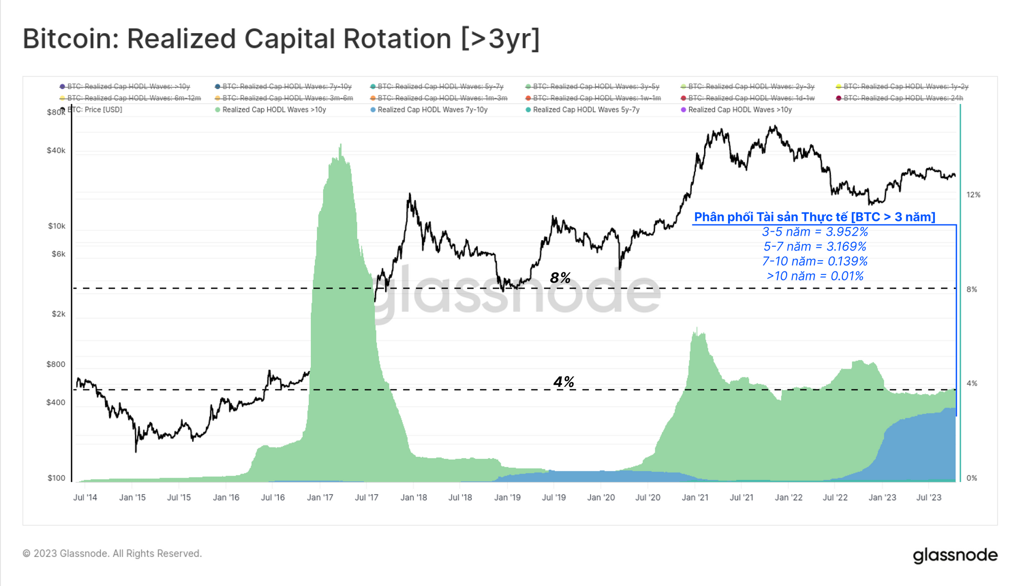 Đầu tiên chúng tôi xem xét các nhóm tuổi thường không nhạy cảm với chu kỳ thị trường, thường là các đồng coin không hoạt động trong ít nhất 3 năm. Điều này có thể được chứng minh bằng cách nhận thấy rằng nhóm thuần tập này nắm giữ một tỷ lệ tương đối nhỏ (<5%) trong tổng tài sản nắm giữ bằng Bitcoin. Hầu hết các Bitcoin trong nhóm này rơi vào phạm vi 3 năm-5 năm, cho thấy chúng đã được mua trong giai đoạn 2018-20.