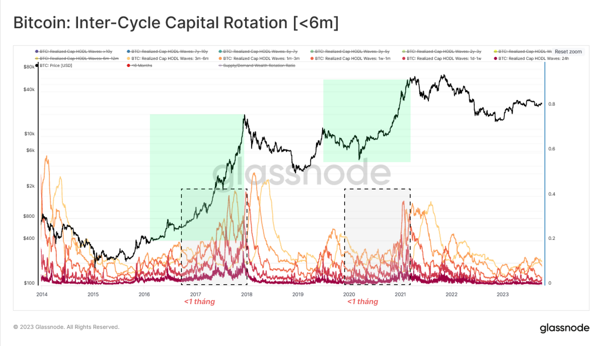 Cuối cùng, chúng tôi xem xét nhóm tuổi trẻ nhất là các nhà đầu tư và đầu cơ ngắn hạn. Các nhóm này liên quan chặt chẽ hơn với dòng vào của nhu cầu, là những đồng coin được giao dịch tích cực đã được đổi chủ gần đây. Các nhóm tuổi này di chuyển ngược lại với nhóm 6 tháng-3 năm, tăng lên trong xu hướng tăng (người mua mới) và giảm trong các thị trường gấu khi sự quan tâm và hoạt động đối với tài sản suy yếu.