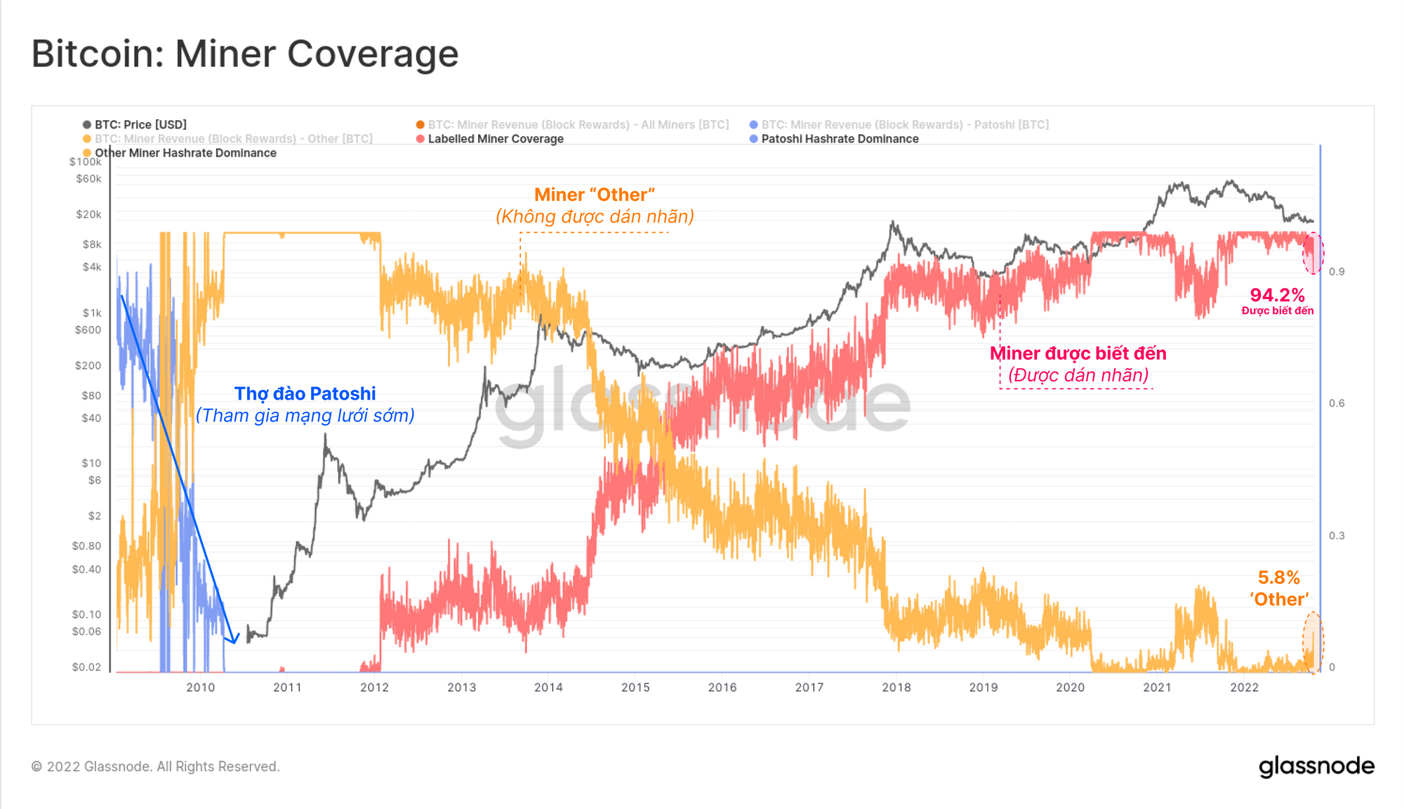 Sau tháng 3 năm 2020, các miner được dán nhãn 🔴 sở hữu đến 95% sức mạnh băm của mạng lưới (đặc biệt là kể từ cuộc Đại di cư của các thợ đào ra khỏi Trung Quốc vào tháng 5 năm 2021). Các miner không xác định được dán nhãn “Other” 🟡 chiếm dưới 5% còn lại.
