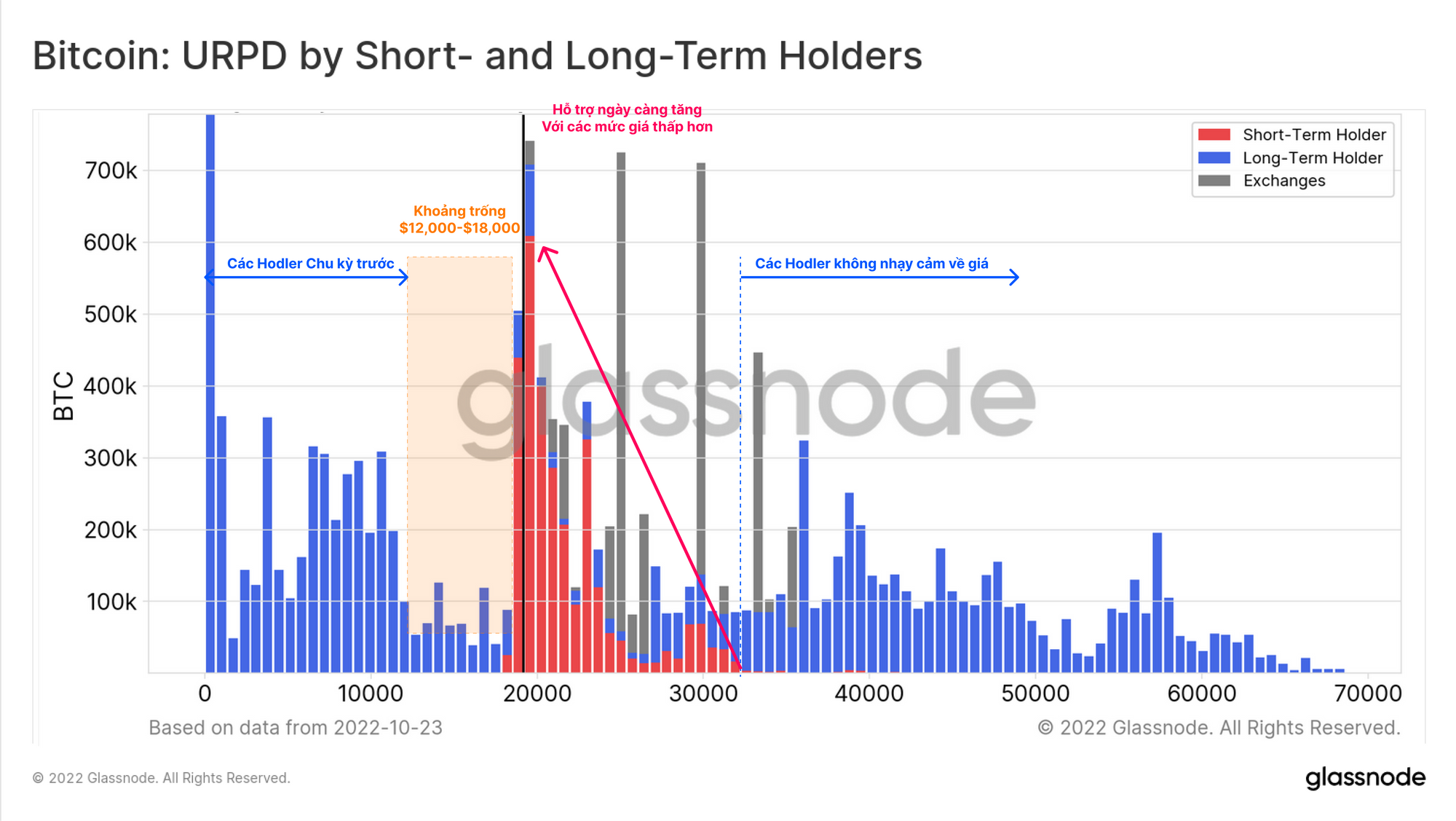 Điều này có thể quan sát được trong biểu đồ URPD, được chia thành Người nắm giữ ngắn hạn (STH, 🔴) và Người nắm giữ dài hạn (LTH, 🔵). Chúng ta có thể thấy rằng khối lượng BTC sang tay những người mua mới gần đây (STH) đã tăng đáng kể ở mức giá từ $18,000 và $20,000, củng cố các quan sát ở trên.