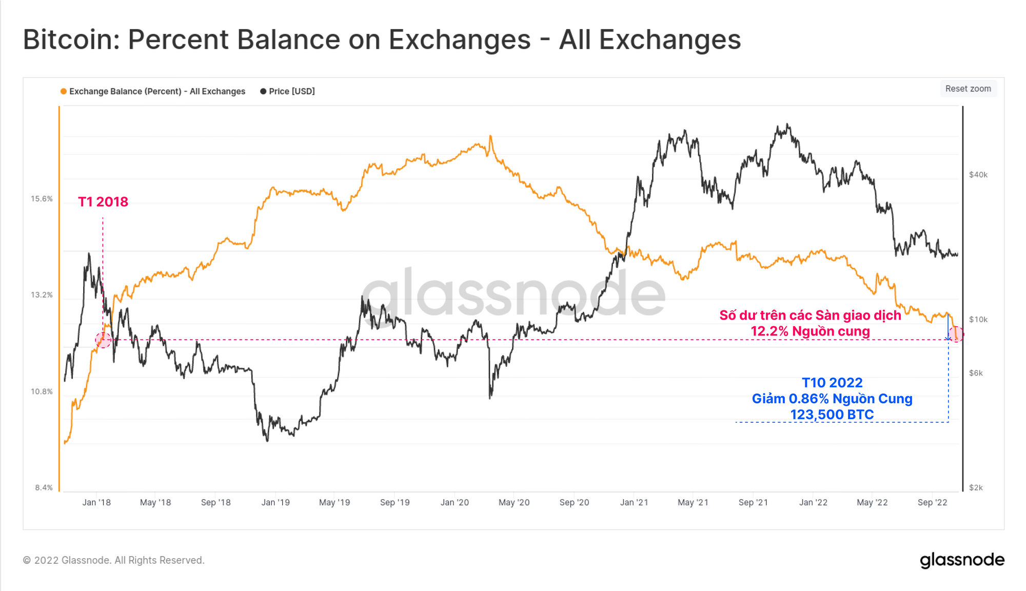 Lượng BTC được giữ trên các sàn giao dịch cũng tiếp tục giảm xuống mức thấp nhất trong nhiều năm trong suốt tháng 10 và quay trở lại bằng với tháng 1 năm 2018. Trên thực tế, tất cả khối lượng BTC chảy vào các sàn giao dịch kể từ mức cao nhất của chu kỳ trước, hiện đã được rút vào các ví không thuộc sở hữu của sàn.