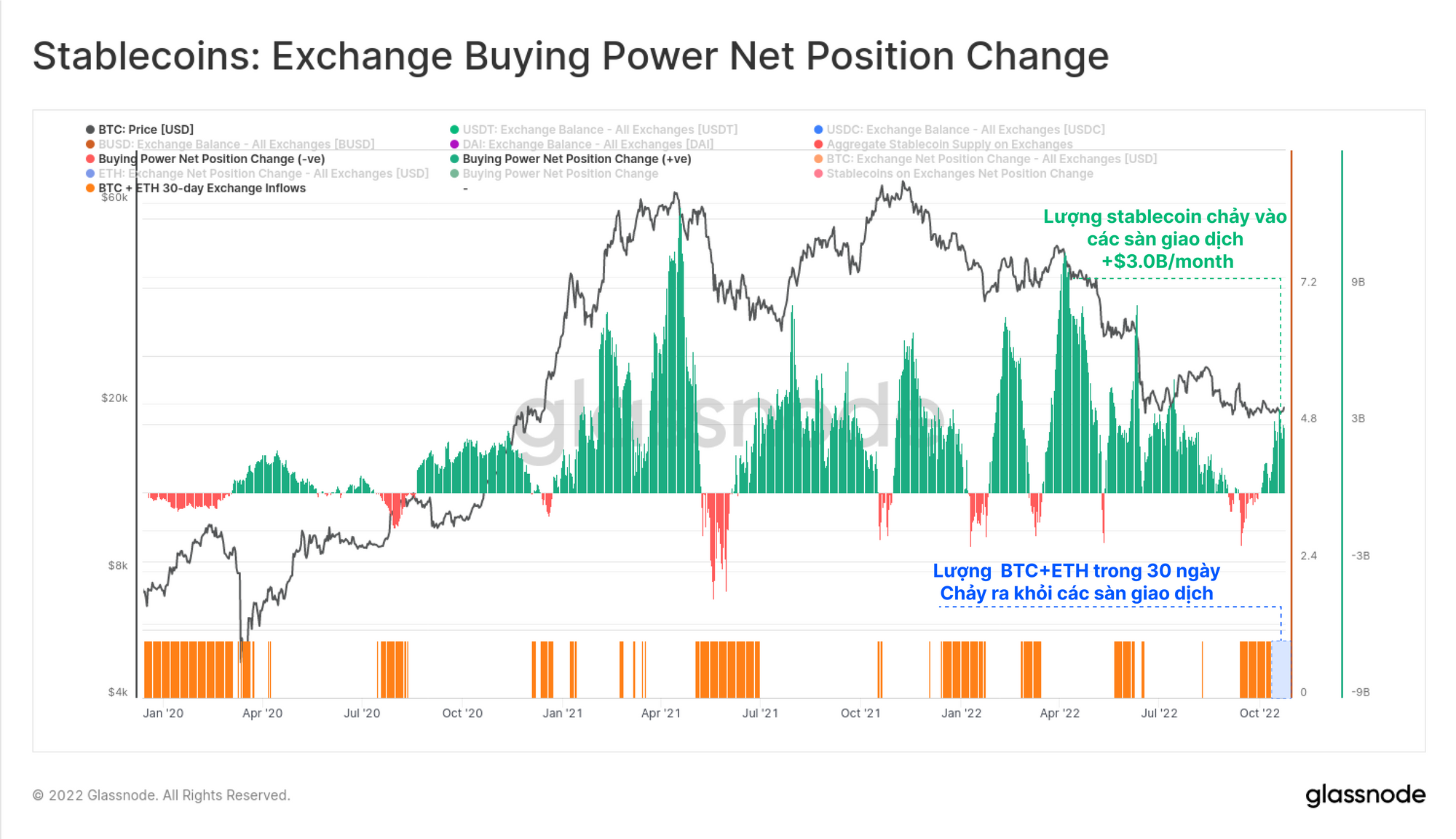 Hiện tại, chúng ta có thể thấy rằng trong 30 ngày qua lượng BTC và ETH đã được rút ra nhiều hơn là nạp vào, đồng thời lượng stablecoin vượt quá $3 tỷ/tháng đã chảy vào các sàn giao dịch, làm tăng sức mua tương đối.