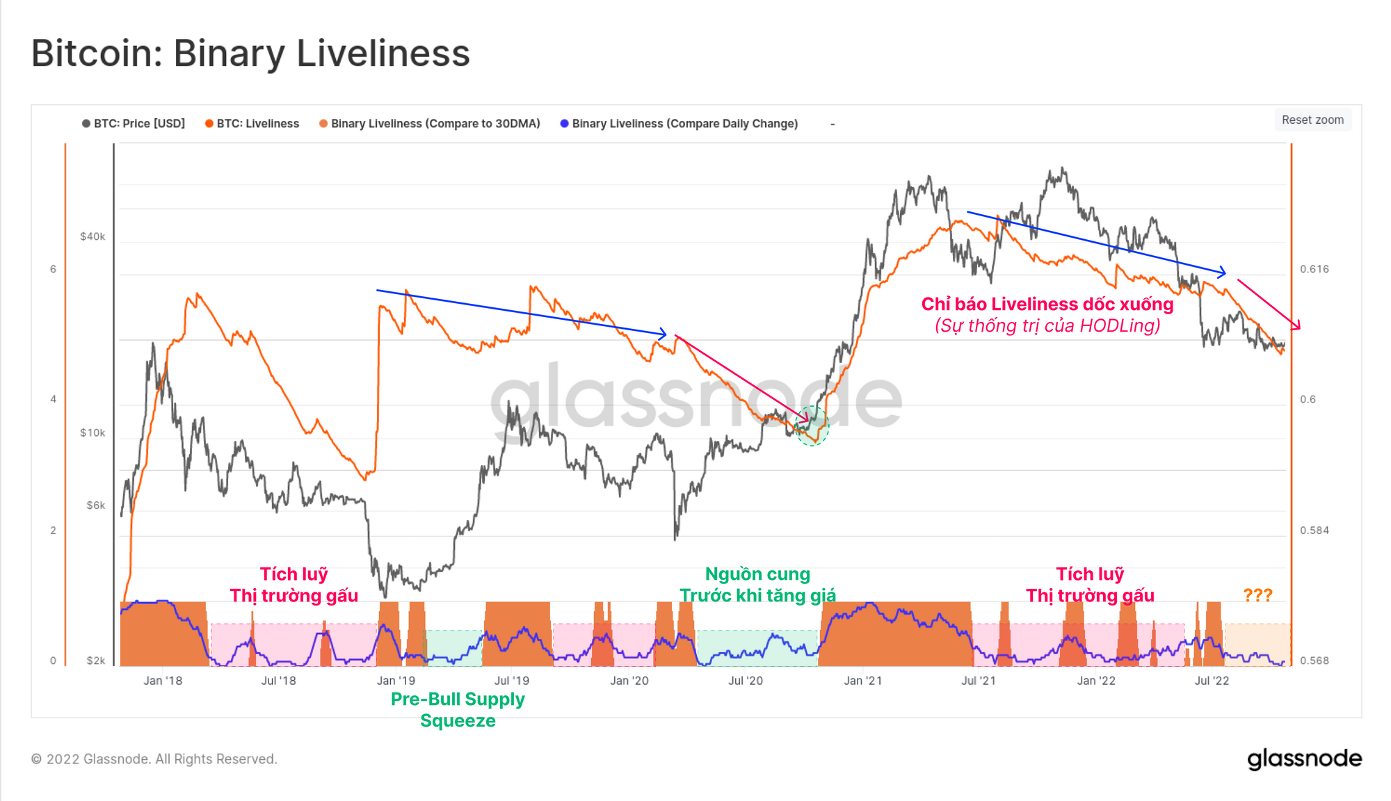 - Chỉ báo Liveliness đang dốc xuống nhanh chóng, cho thấy thị trường đang rất phù hợp với hành vi HODLing. Những nhà đầu tư cũ đơn giản là không bán BTC.