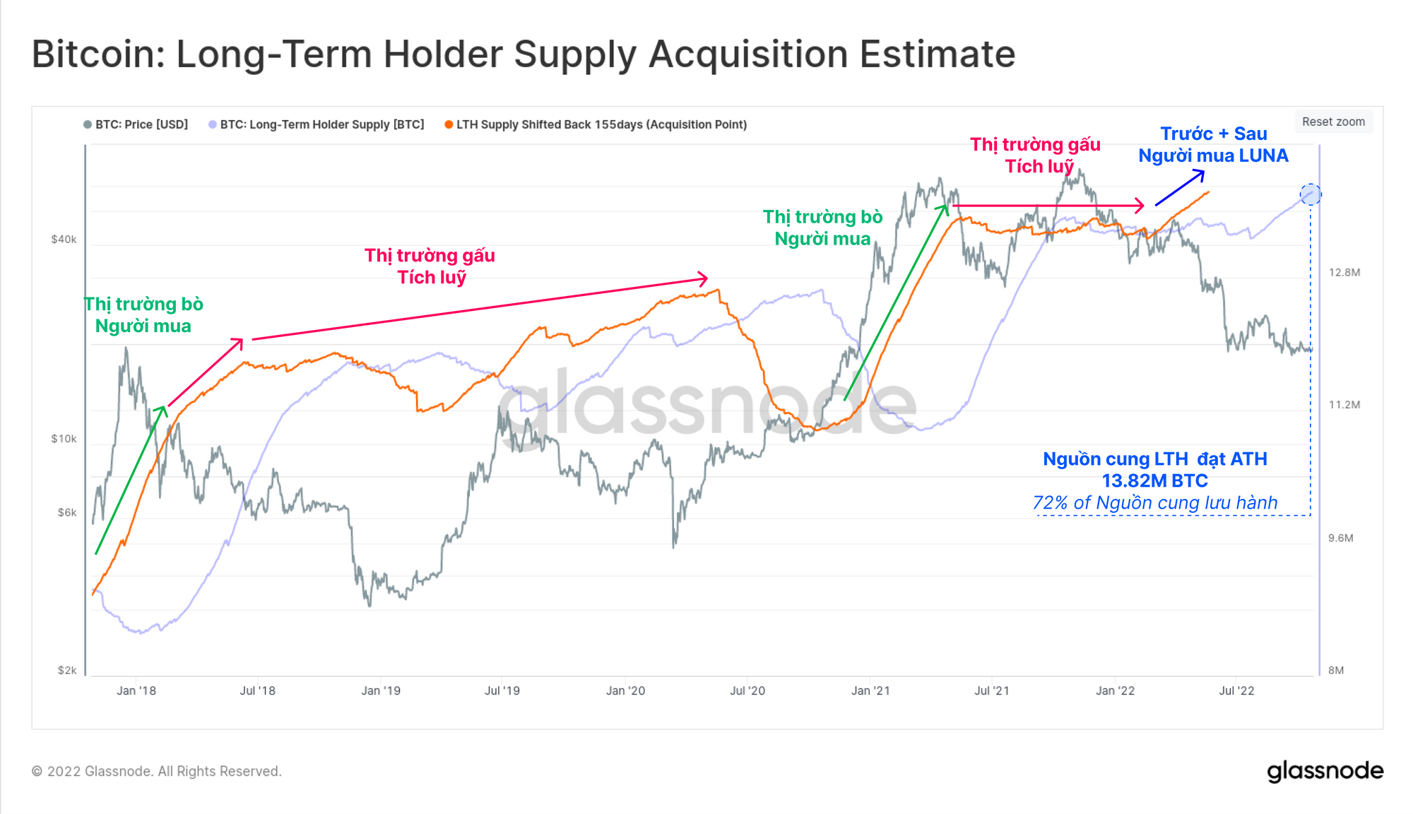 Bất chấp các sự kiện bao gồm gía BTC đã giảm 56% từ $40,000 xuống còn dưới $18,000, sự kiện tháo gỡ đòn bẩy tài chính trên phạm vi toàn ngành và tình hình bất ổn kinh tế vĩ mô toàn cầu , nhóm LTH đã mua thêm một lượng BTC đáng kể trong suốt giai đoạn này.